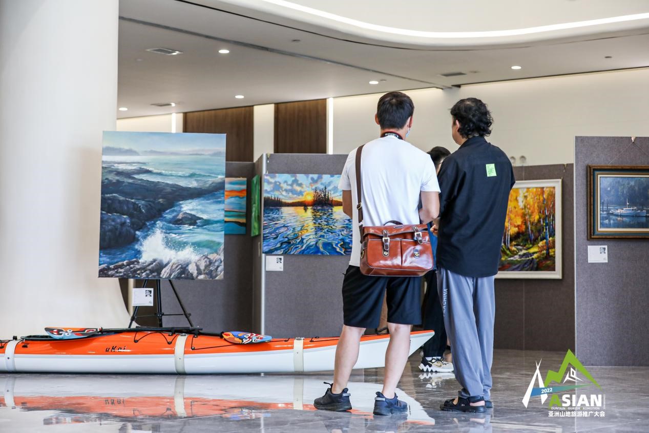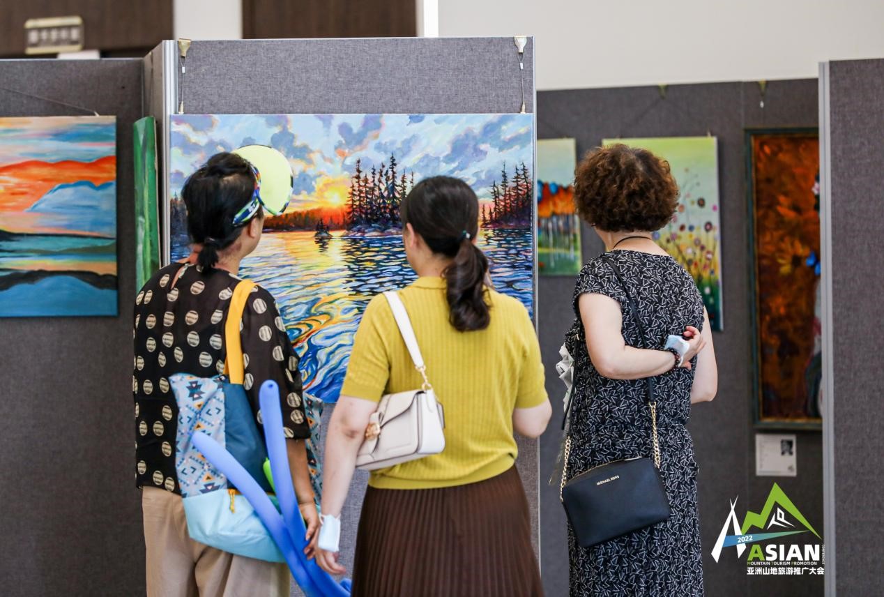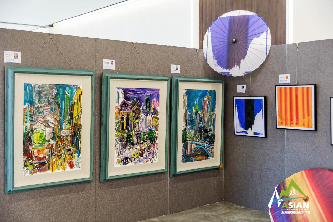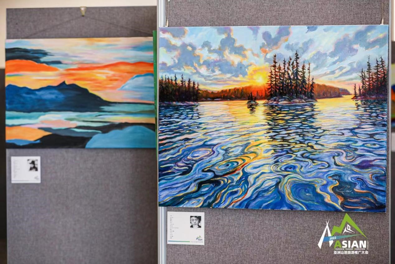 在山地艺术空间展的展厅的一角挂满了各种各样浓缩的风景,有金黄浓郁的秋日林道、色彩交叠的生命之树,还有绿意丛生的雨林和青苔丛生的山涧溪流……这些精彩的画作全部来自于北美艺术工作室,旅加艺术家胡军介绍,他们想通过艺术来唤醒美的意识。“art just like medical!艺术有时候是可以‘疗心’的,带来快乐,给人活力。我们这次的创作是把旅游的元素和艺术的元素做了一个结合,希望通过旅游唤醒大家对自然的美好憧憬,也通过艺术来呈现旅游的另一种新形态。”