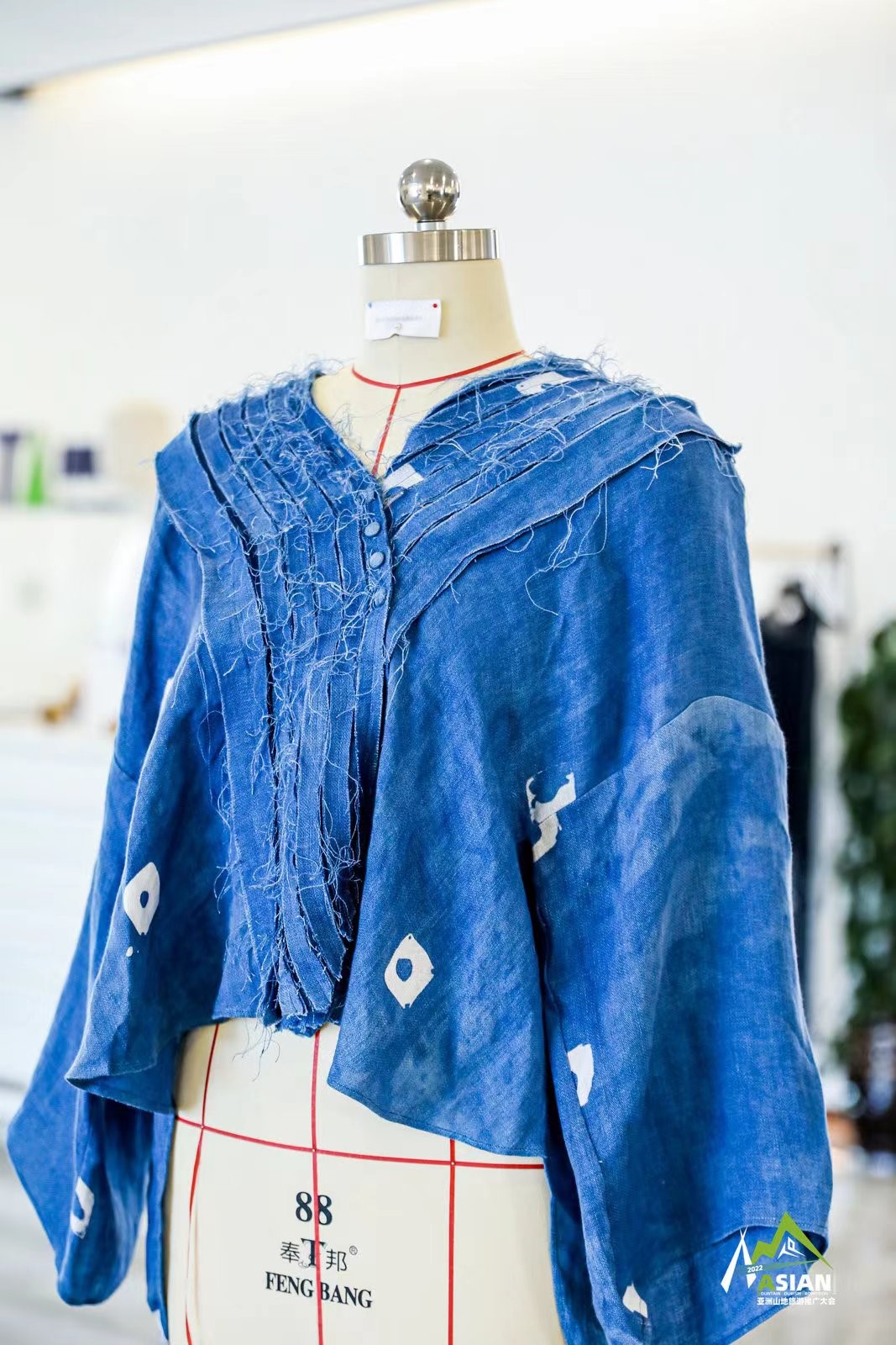除了丝网印刷的民族图案T恤,郭冰还将蜡染工艺与时装相结合,以不规则剪裁、拼接层次、染印层次,抽象化呈现似房顶、吊脚、瓦片等古建筑群元素的造型,建筑线条与服装线条经立体剪裁工艺得到完美结合,多处细节以手工绗缝精细处理。“本次展出的衣物面料都是100%亚麻,以贵州省级非遗传承人伍德芬女士的纯天然古法手工印染工艺为面料染色,每一件的印染效果都是独一无二的呈现。”郭冰介绍,“我们希望在保留传统工艺的同时强调新时尚,设计元素和表达都是最能够紧扣当下的潮流与时代主题。以这次展览我们带来的展品为例,这是非常能够代表我们本民族的一个蜡染的蓝色,非常传统,但也非常漂亮。我们就想要把它做到更加时尚化,在和陈红琪老师的艺术交流中我们也一直努力尝试改变,因为贵州的少数民族服饰虽然漂亮,但比较难穿戴,生活当中装饰性有时大于实用性,所以我们不想做简单粗暴的传承,而是将传统的元素融入其中,能够更加渗入到日常生活。”