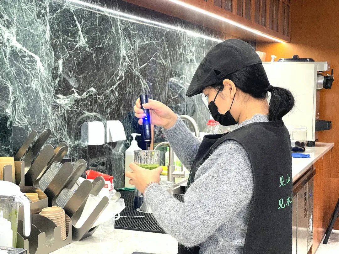 推开“廿柒葉”原木店门,抹茶绿与暖白交织的清新感扑面而来。吧台后,联合创始人冉丝正持茶筅搅打翠色茶粉,阳光透过木窗落在梵净山文创与手工茶点上,暖光裹着茶香,铺就一方静谧休闲空间。