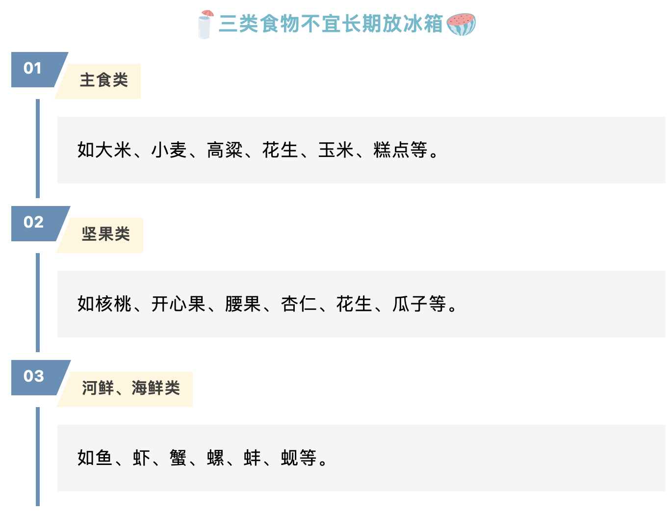主食类和坚果类食物容易发霉,长期存放在冰箱中会滋生黄曲霉毒素。这是一种剧毒物质,一次过量食用可导致急性中毒,长期摄入可致癌。河鲜、海鲜类食物储存太久后,其中的溶性蛋白质会大量流失,还会产生氨、硫化氢等有害物质,人食用后可能发生中毒。河鲜、海鲜类食物易滋生李斯特菌,人摄入后可引起腹泻、发烧、中毒、血液和脑组织感染等多种严重后果。