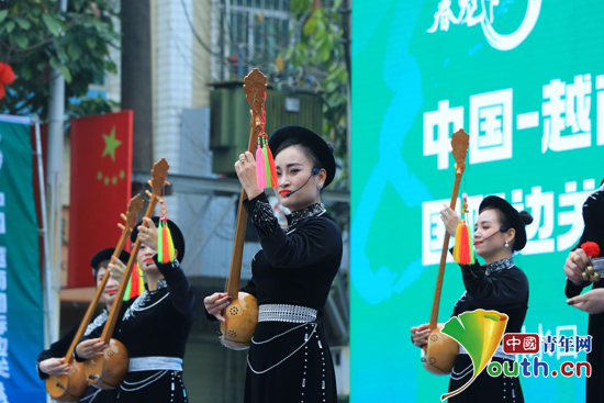 2023年中国-越南国际边关“春龙节”暨胡志明足迹中越友谊之旅线路发布会活动在龙州县水口口岸举行。图为活动中的文艺节目表演。浙江师范大学研支团供图