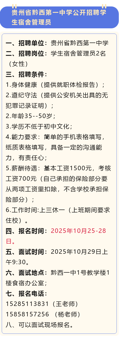【事业单位】学校招聘学生宿舍管理员!上三休一!初中起报!