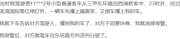 近日,毕节市织金县金南路延伸段龙湾国际路口处发生一起交通事故,随后,肇事车辆逆向行驶驶离现场。