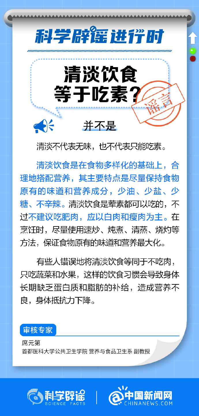 中新网11月6日电 清淡不代表无味,也不代表只能吃素。清淡饮食是在食物多样化的基础上,合理地搭配营养,其主要特点是尽量保持食物原有的味道和营养成分,少油、少盐、少糖、不辛辣。清淡饮食是荤素都可以吃的,不过不建议吃肥肉。(来源:@科学辟谣 @中国新闻网)
