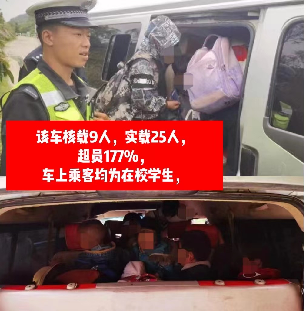 六盘水市木果镇交警也获了一起严重超员的“黑校车”载7人实载18人,超员率157%!
