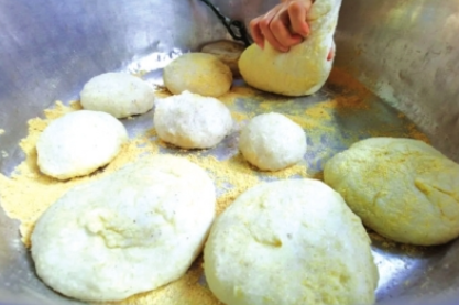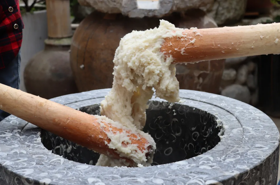 刚打好的糍粑冒着热气,散发着清香,裹上黄豆面,一口咬下去满嘴清香。糍粑黏结成团,寓意着家庭和睦团结,幸福美满。