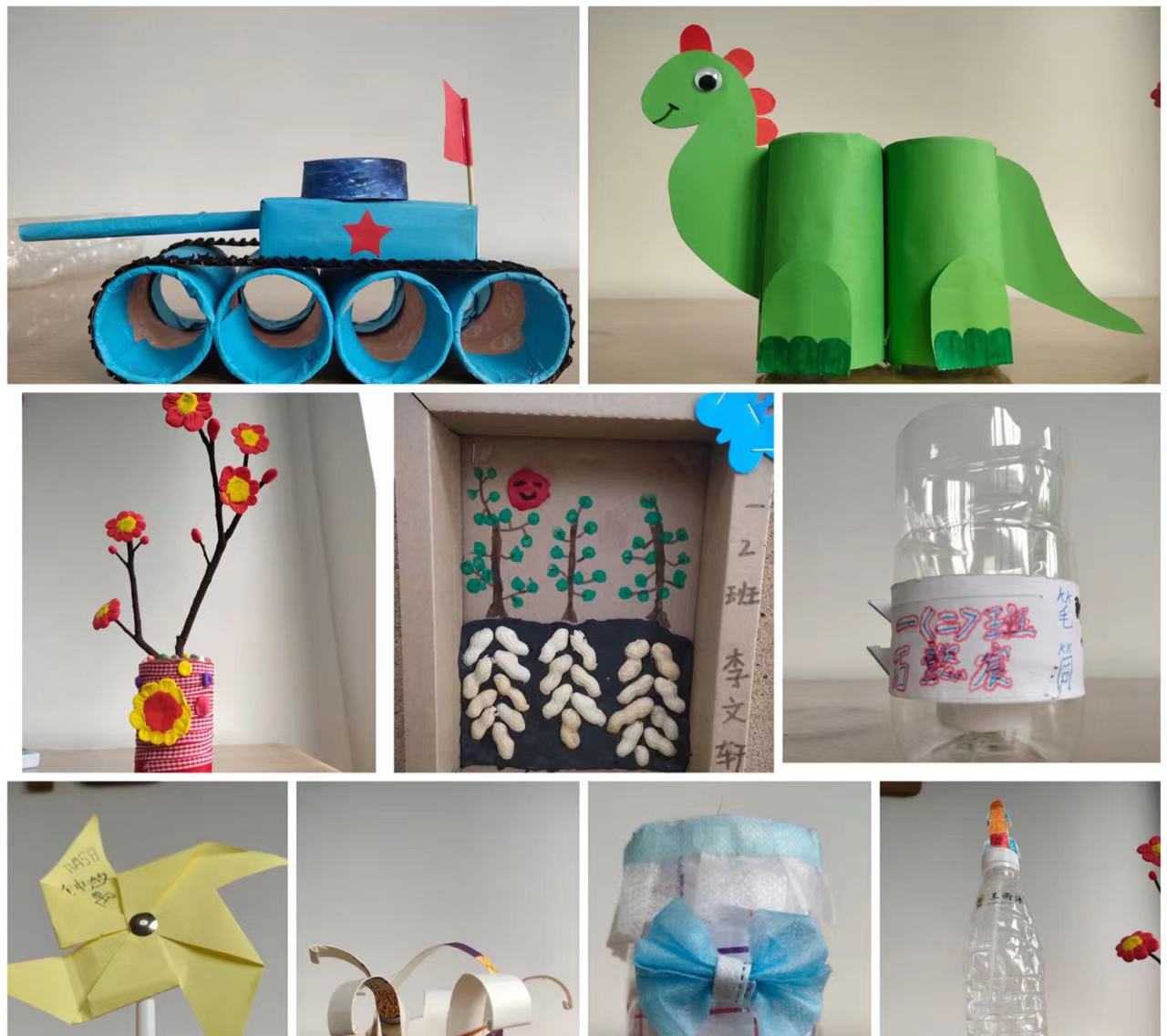 除此之外,低年级学生还进行了“变废为宝”垃圾回收利用活动。利用废弃物品进行亲子手工制作,充分发挥聪明才智,把身边的“废物”再利用,变废为宝,创造奇迹!