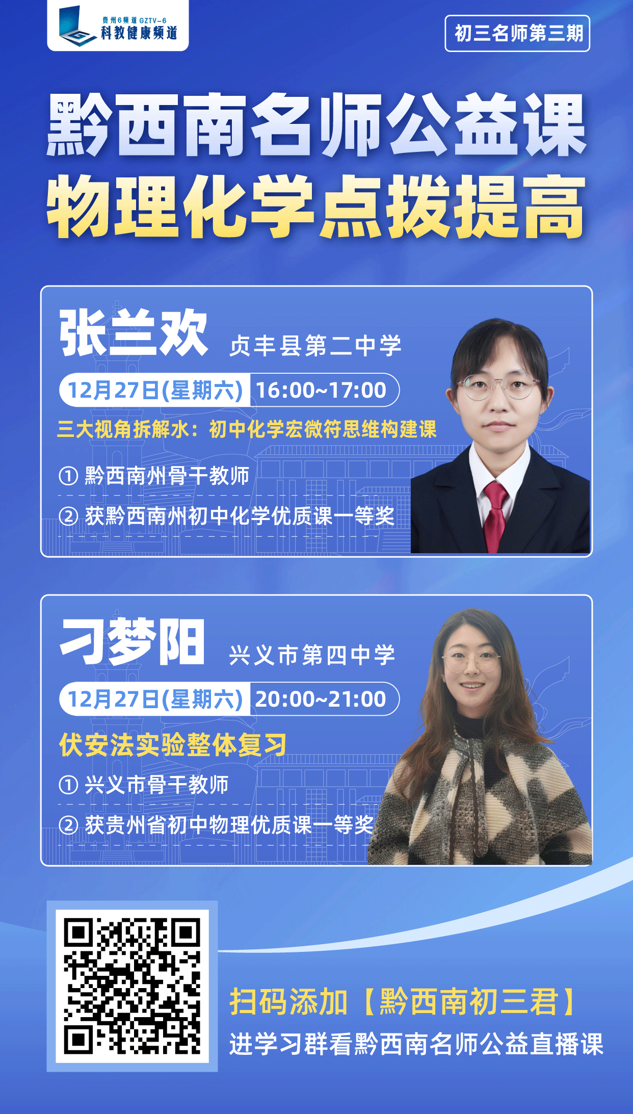 本周邀请贞丰县第二中学张兰欢与兴义市第四中学刁梦阳老师带来物理化学双科专题拔高课程!
