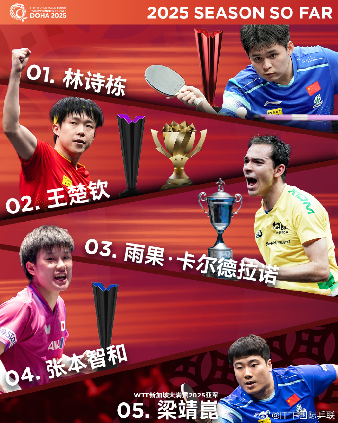2025多哈世乒赛倒计时10天,“ITTF国际乒联”发布男女单前五号种子名单。