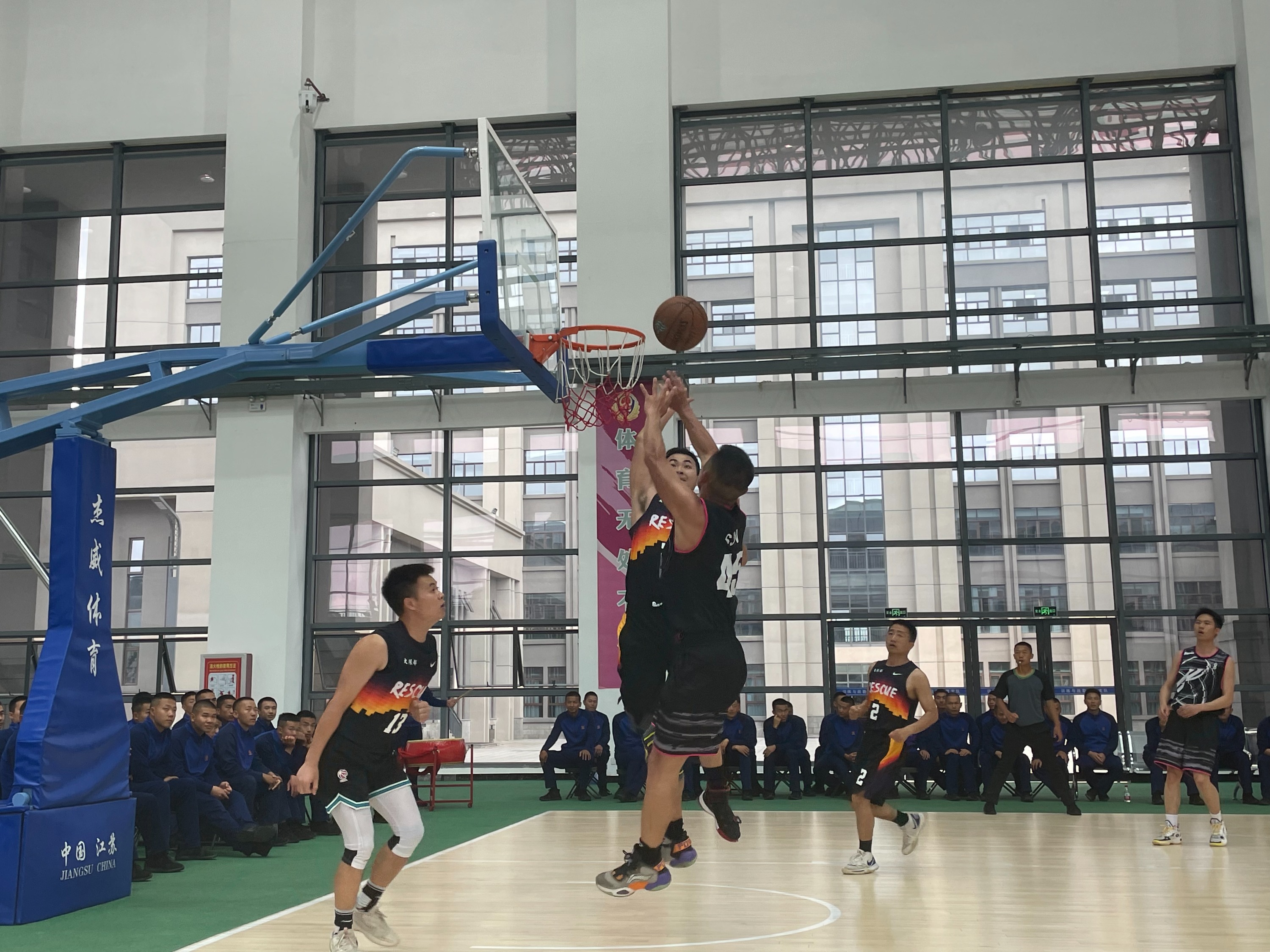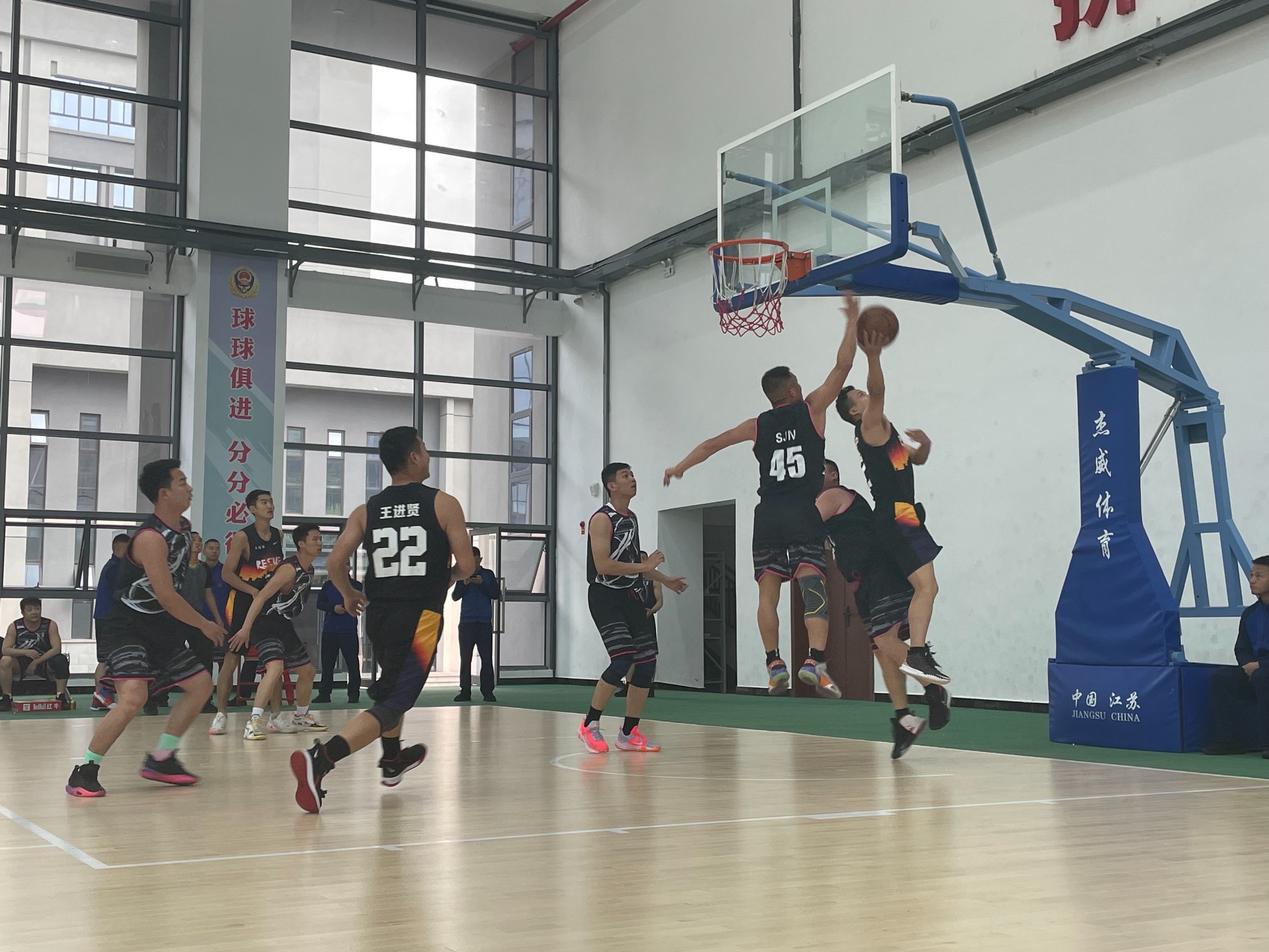 竞赛过程中,参赛双方代表队一同喊着向对方学习的口号进入场地,赵兵政委为比赛开球。随着篮球抛向空中划出一道美丽的弧线,比赛正式开始。赛场上,队员们个个生龙活虎,身手敏捷,抢断、掩护、助攻,积极拼抢篮板,精准投篮、你争我夺。比赛双方实力相当,你来我往,打的难解难分,比分交替上升,扣人心弦,赢得了场下观众的阵阵喝彩。