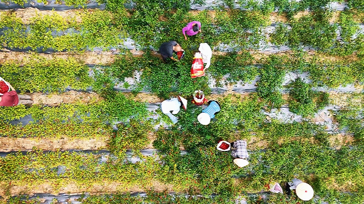 火红的辣椒一簇簇、一坡坡,把黛色的山脊染得热烈而明亮。