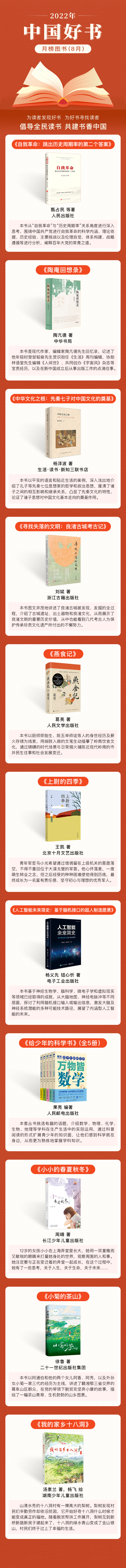 在中宣部出版局指导下,经中国图书评论学会组织评选,2022年8月“中国好书”榜单发布:《自我革命:跳出历史周期率的第二个答案》《陶庵回想录》《中华文化之根:先秦七子对中国文化的奠基》《寻找失落的文明:良渚古城考古记》《燕食记》《上尉的四季》《人工智能未来简史:基于脑机接口的超人制造愿景》《给少年的科学书》(全5册)《小小的春夏秋冬》《小菊的茶山》《我的家乡十八洞》入选。