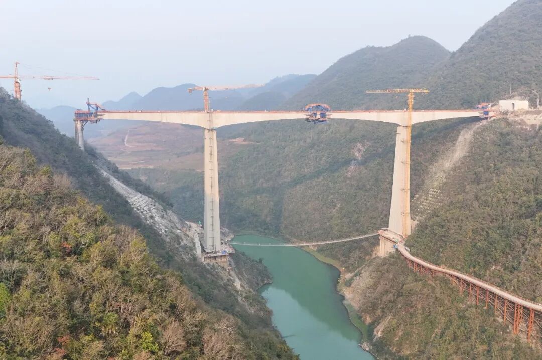 1月26日,瓮马铁路南北延伸线项目重难点工程——瓮安河大桥主梁中跨顺利合龙。该桥全长395米、距河面高度约200米,主桥采用(90+168+90)米预应力混凝土连续刚构,是目前国内外单线货运铁路连续刚构建设领域的大跨度标杆工程。
