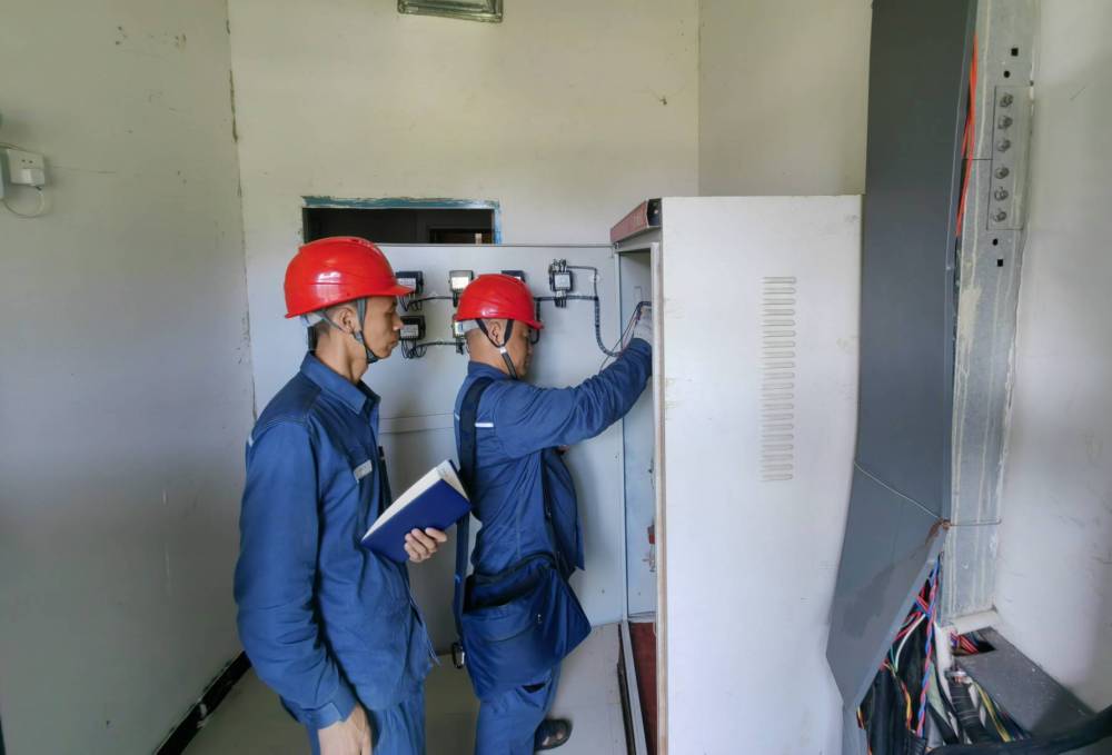 供电服务人员在景区酒店配电房帮助排查用电隐患。