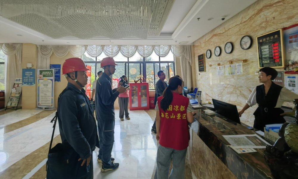 供电服务人员在景区酒店查看了解经营情况和用电情况。