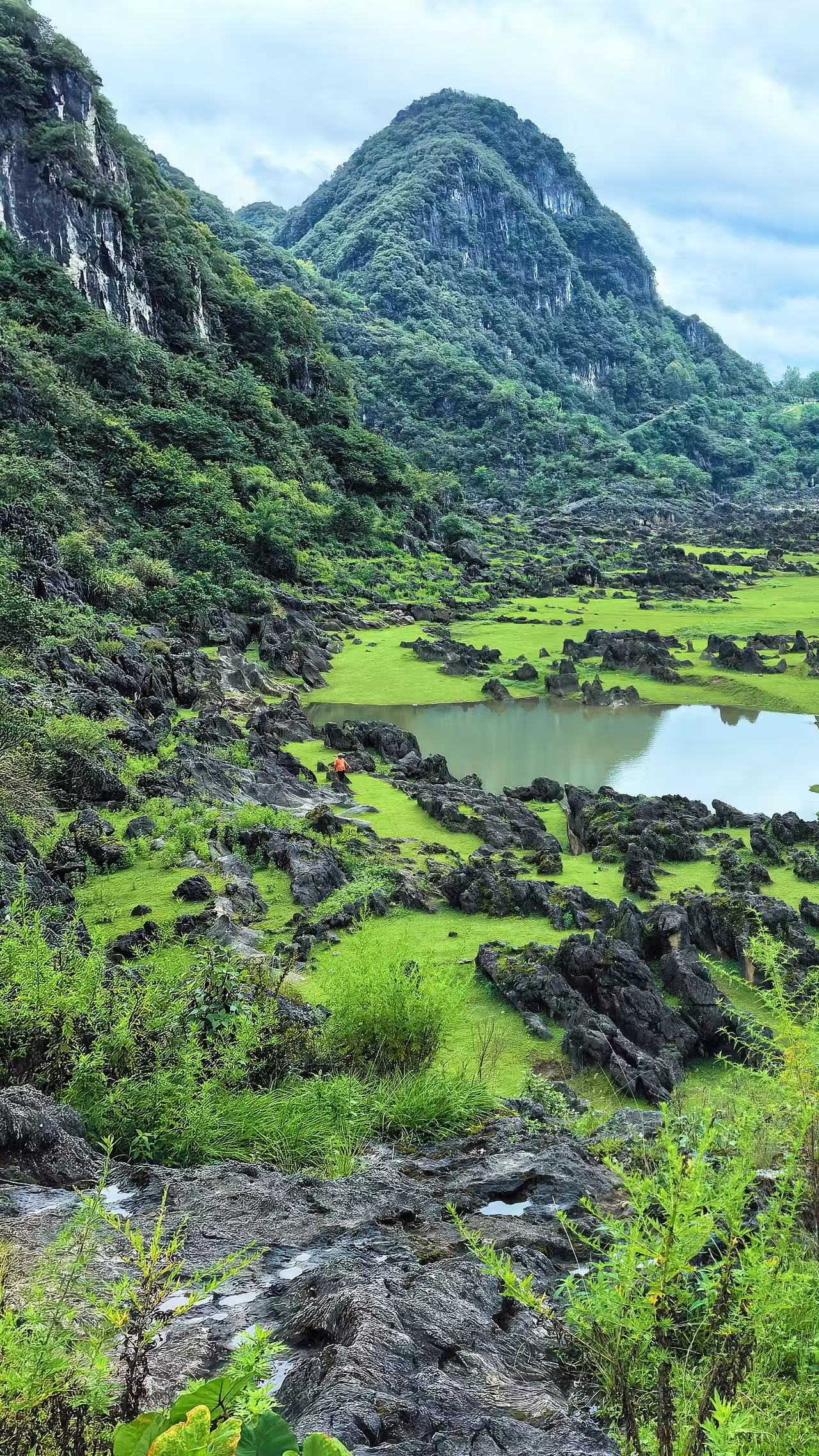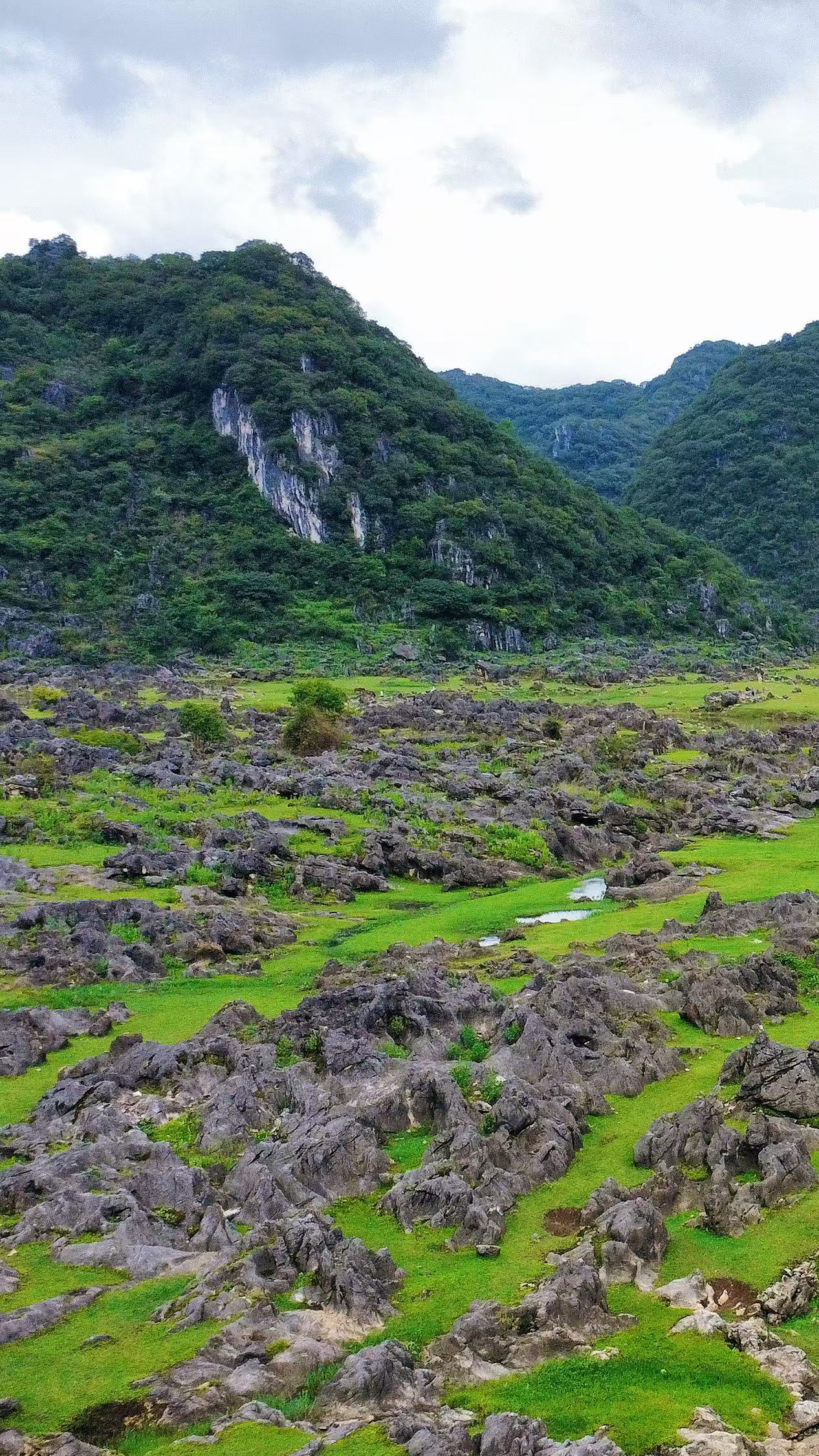 灰黑色的龙鳞石林如巨兽獠牙交错,构成天然迷宫,谷底翡翠色溶蚀湖与石阵相映,宛如外星地表。地下暗河奔涌的共鸣似铜鼓轻鸣,漫步其间,每一步都能邂逅石缝间的惊喜与不期而遇的野趣,自带“孤独星球”的空灵氛围感。