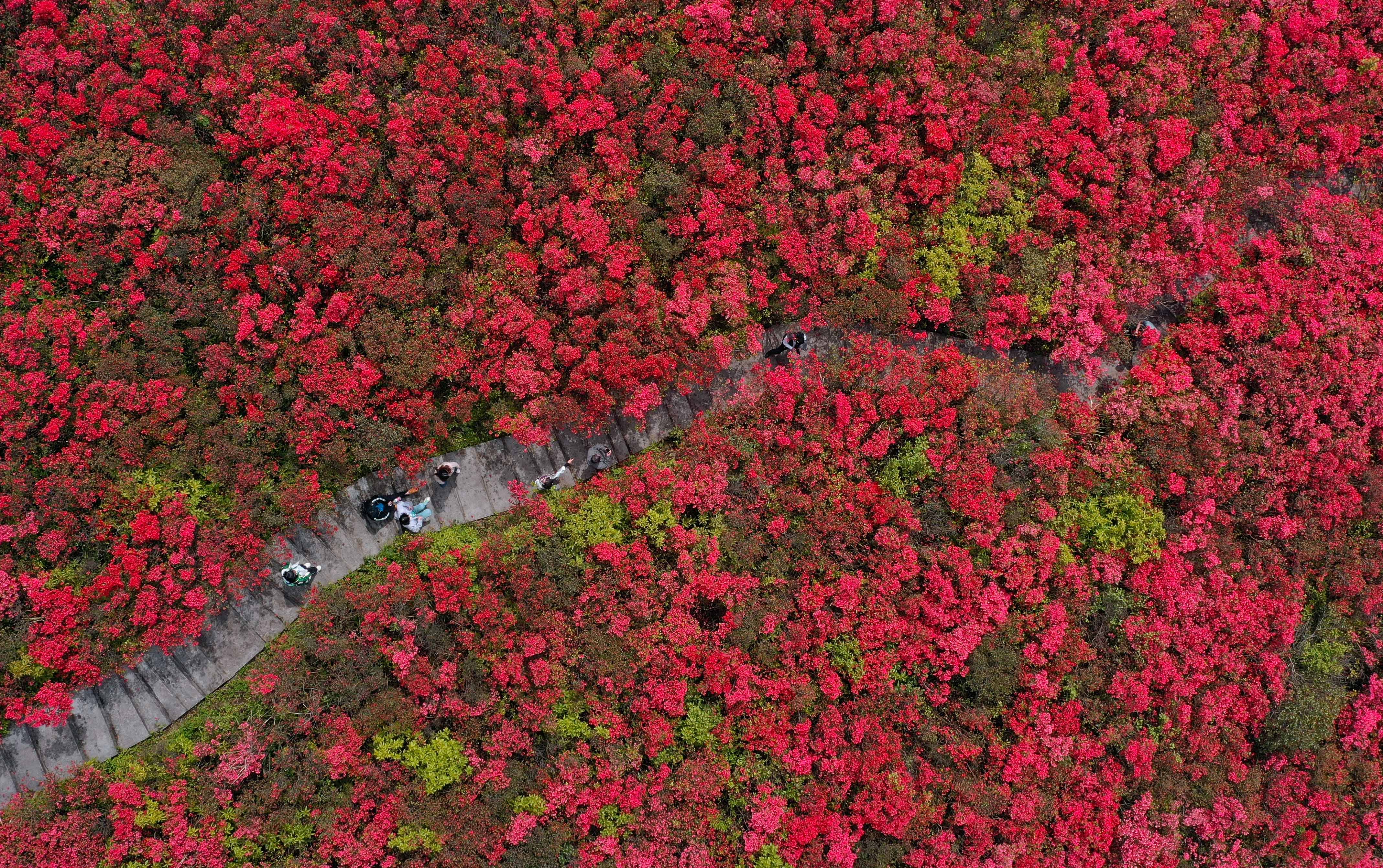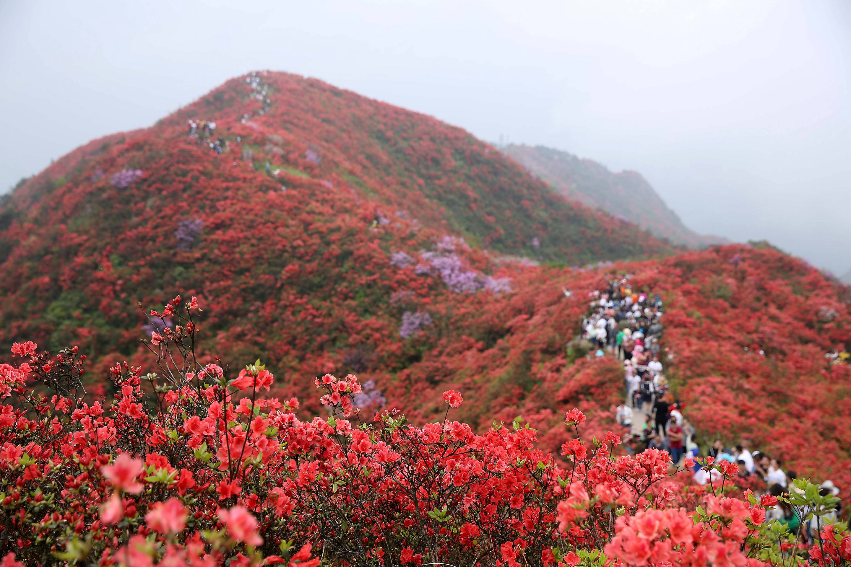 每年4月中旬到5月初,正是龙泉山的最佳赏花期,万亩映山红循着春的信号次第绽放,以炽热的赤红为主调,点缀着粉紫、莹白的花影,将整座山染成一片壮阔的红色花海,远远望去似烈火燃山,美得惊心动魄。