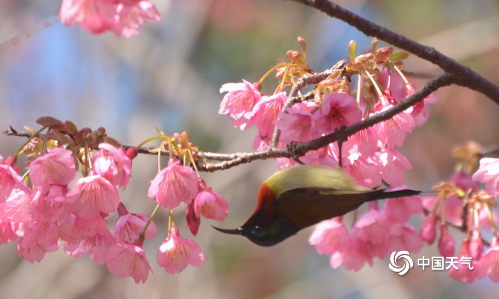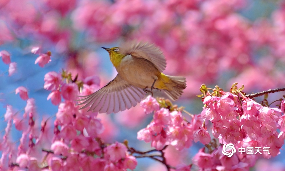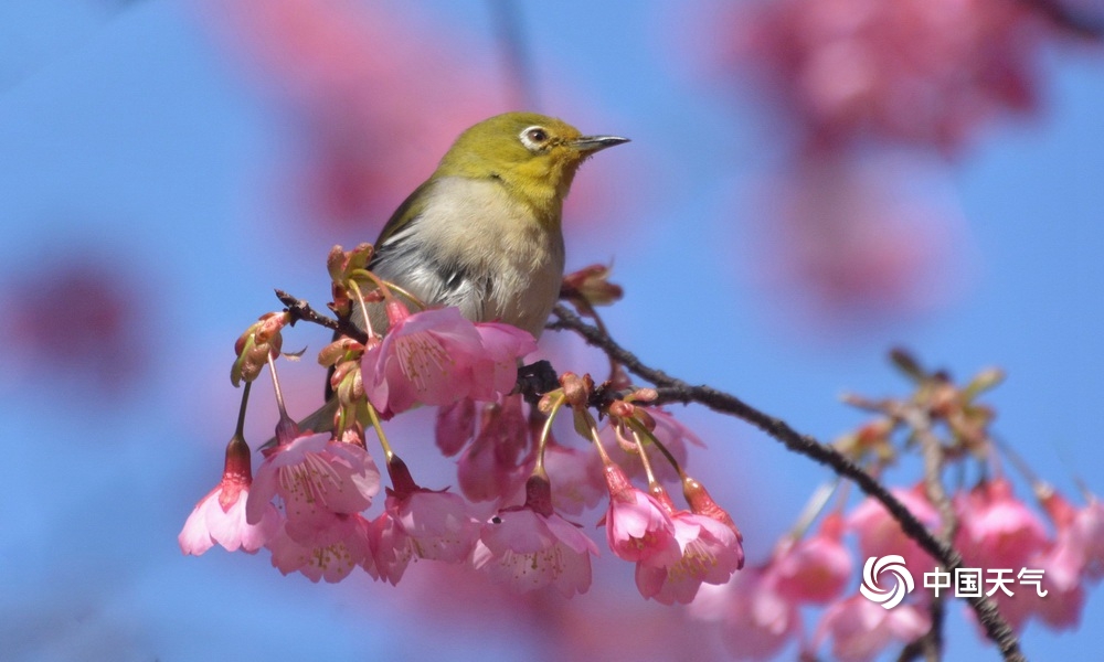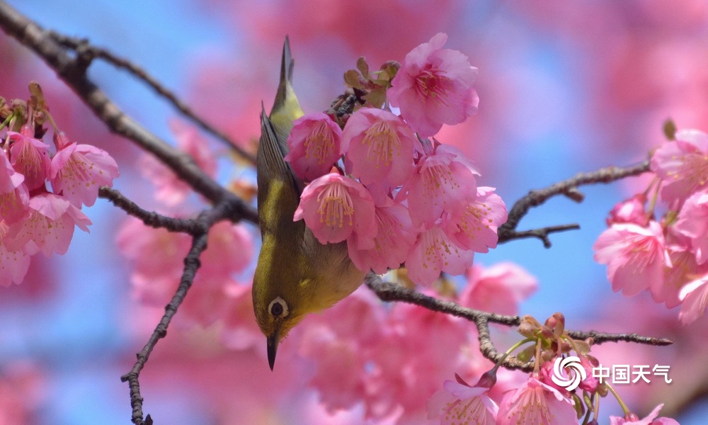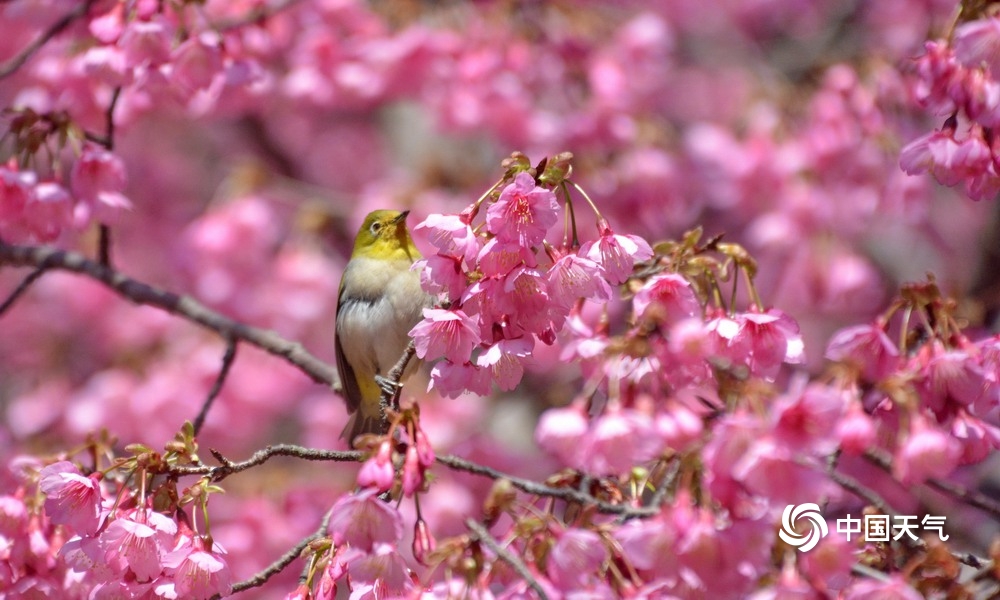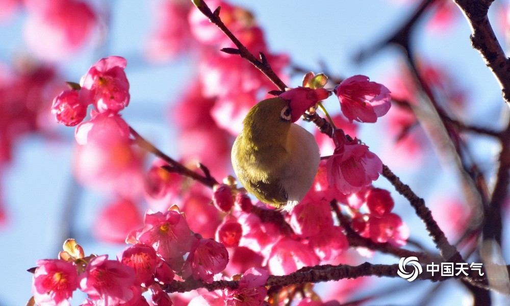 中国天气网讯 近日,福州森林公园樱花绽放,迎来很多小鸟,一片鸟语花香,生机盎然的景象。图片拍摄于2023年1月29日至30日。(图文/黄典藩)