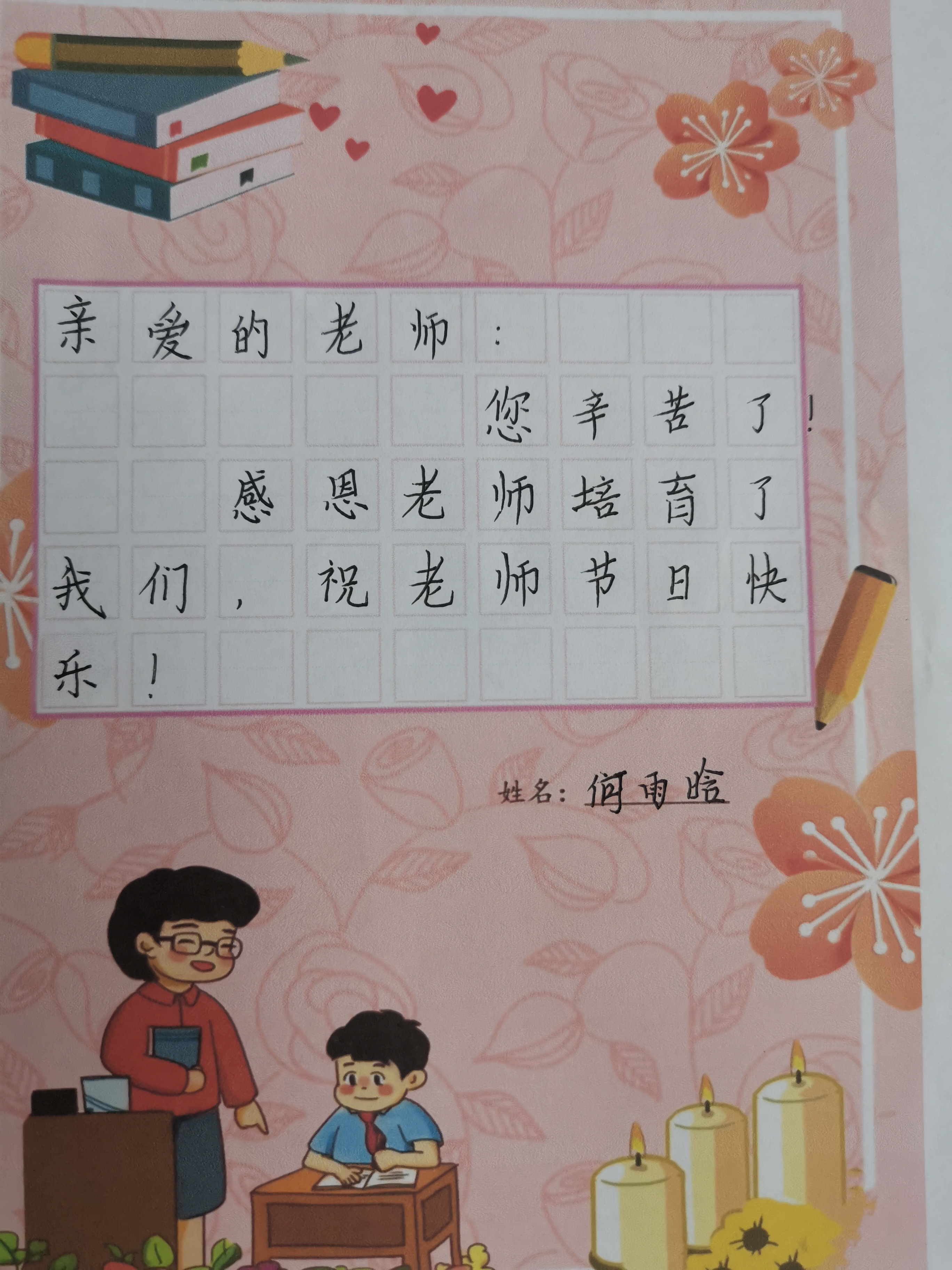 “种得人间桃李满,春风无地不开花。”何雨晗为老师们写上这副对联后,还用信笺手写寄语。
