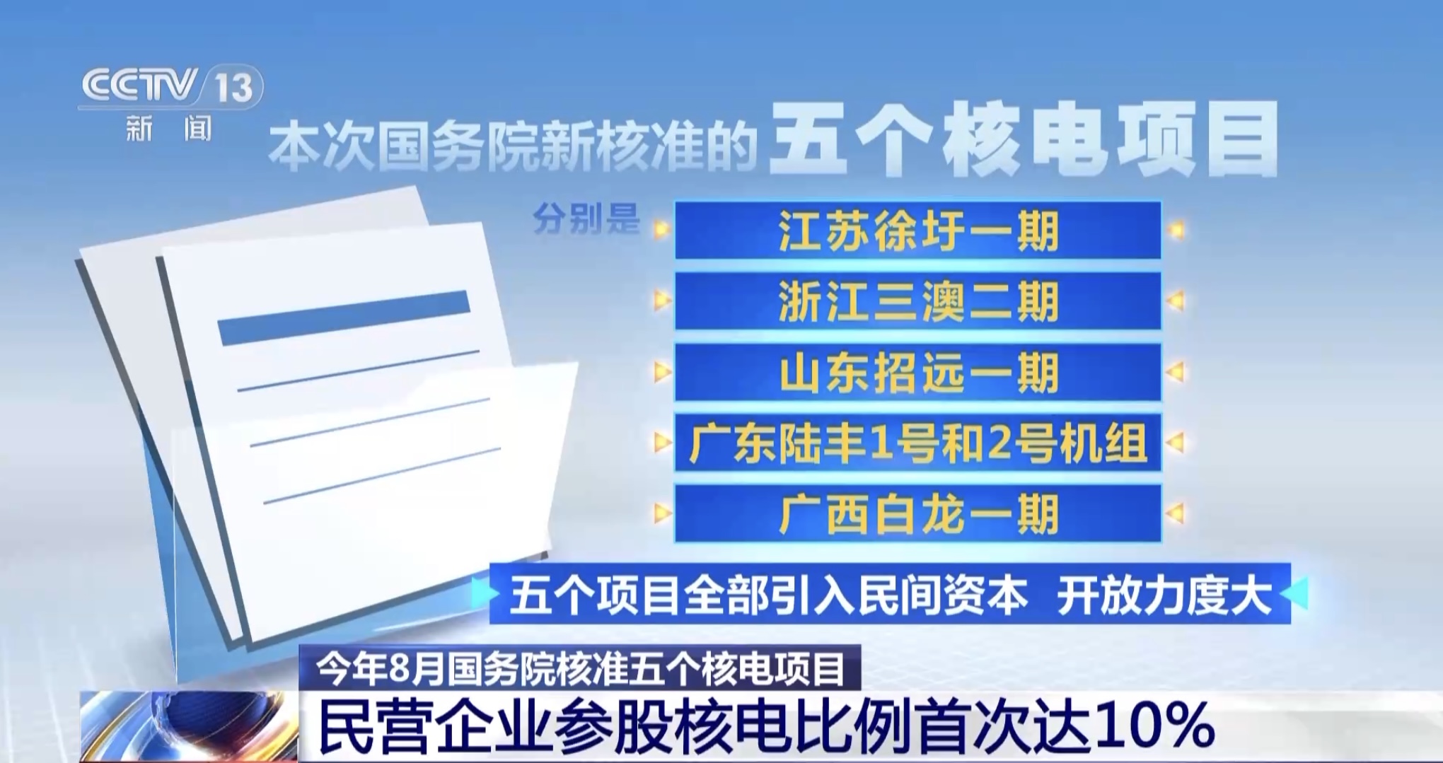 国家发展改革委消息,今年8月国务院核准的五个核电项目,由央企控股投资建设,都引入了民间资本,且民营企业参股比例首次提高到了10%,一共有10家民营企业参与,合计出资45亿元作为项目资本金,预计可带动民营企业投资超过240亿元。