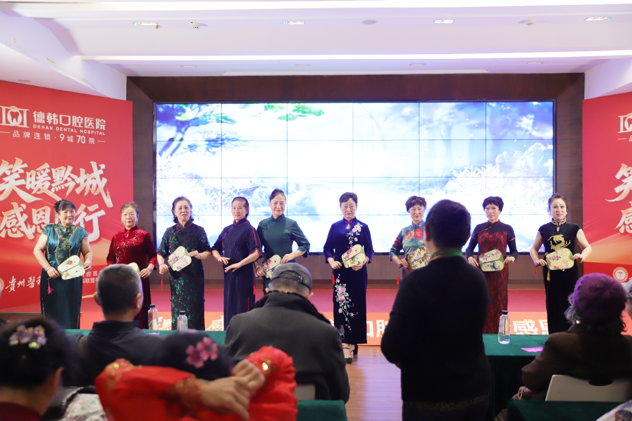 贵阳德韩口腔医院特别邀请黄金典雅艺术团献上精彩演出。舞蹈《知青小屋》以复古韵律唤醒集体记忆,《采茶舞》通过灵动舞姿传递自然生机,而压轴的时装秀《美旗袍》则将传统服饰与现代审美融合,模特们身着定制旗袍款款而行,彰显东方美学魅力,台下掌声与欢呼声不断。