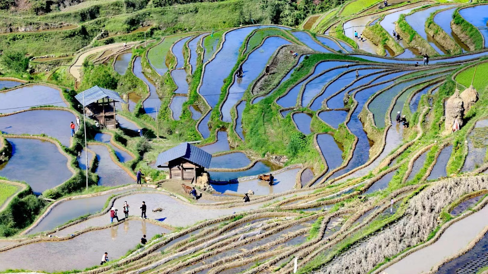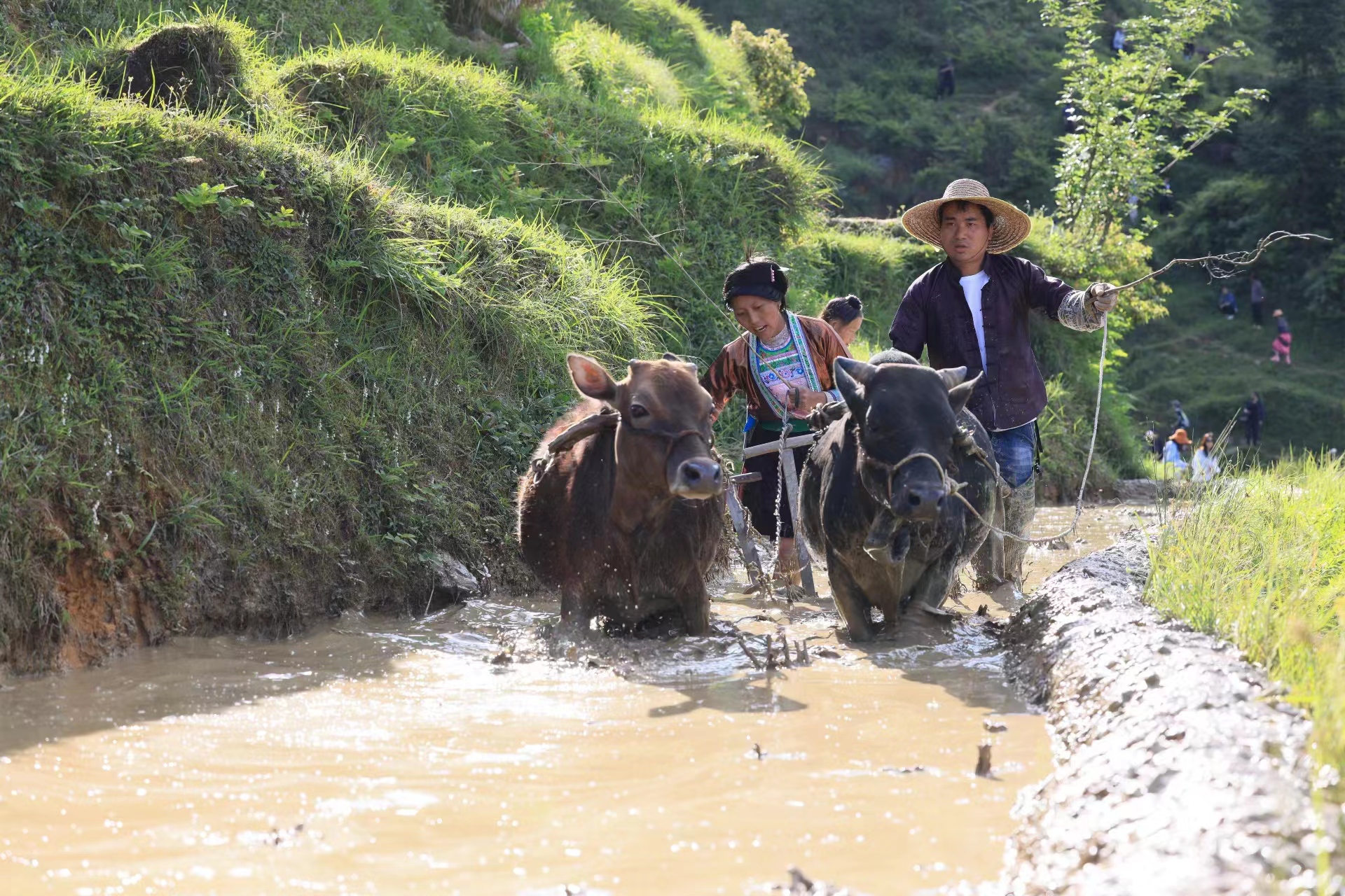 加榜梯田位于贵州省黔东南州从江县加榜乡的东北面,总面积近万亩。这里是国家级湿地公园,是贵州生态文明建设的典范,民间深厚的农耕文化,更是当地苗族人民智慧的结晶。许多古田依山修筑,蜿蜒千余米,如同“等高线”布局在一座座百米高的山梁上,每年的四到五月是梯田注水的季节,满水后的梯田银光闪闪,头头耕牛点缀其间,如同五线谱上跳跃的音符。今年“五一”小长假期间,从江县加榜梯田核心景区再次开门迎客,少数民族传统“百牛齐耕”仪式、“开秧门”仪式、自行车环加榜梯田骑行活动以及民族文化互动表演、体验乡村民宿、品尝农家特色美食等系列农耕文化主题活动相继展开,省摄影家协会的专家们也流连期间,一幅幅壮美的摄影作品瞬间凝固。