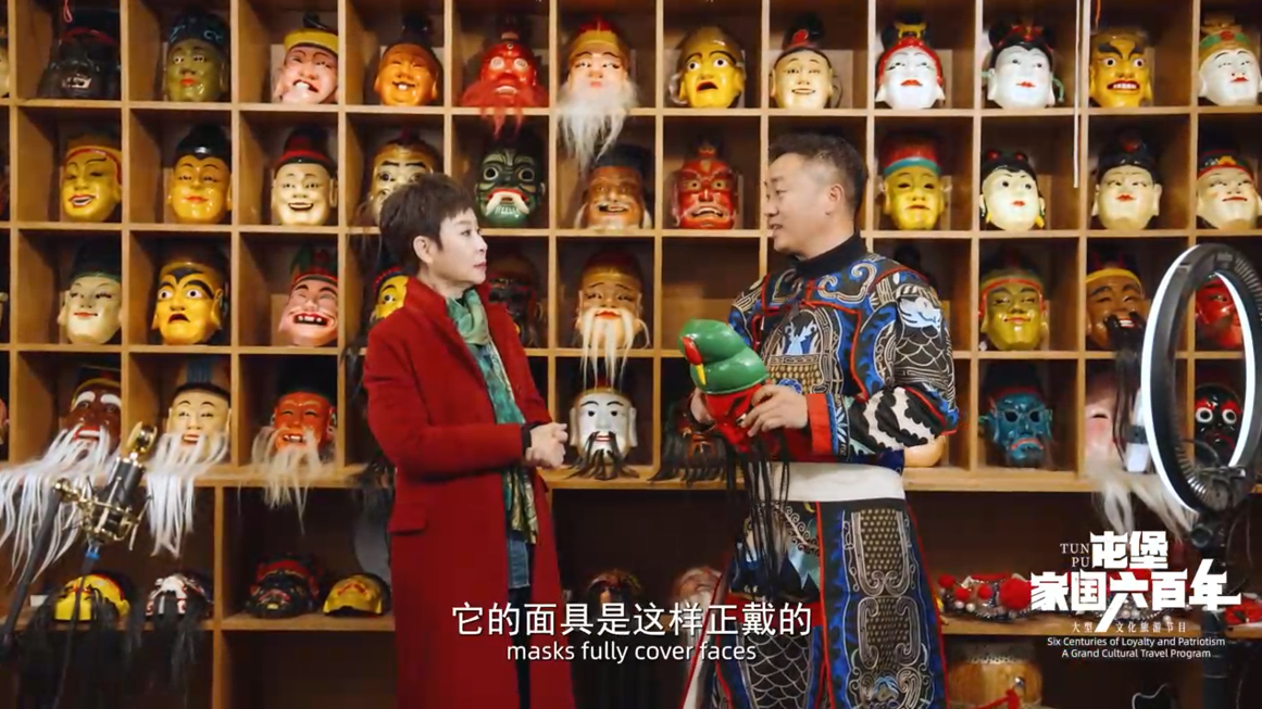 “阳戏和地戏的区别是,地戏把面具戴在额头上的,但是阳戏戴的面具是正戴的,还必须要戴上红色的头巾。就像分阴阳一样,有天就有地、有男有女的这种感觉。”周仕发说。