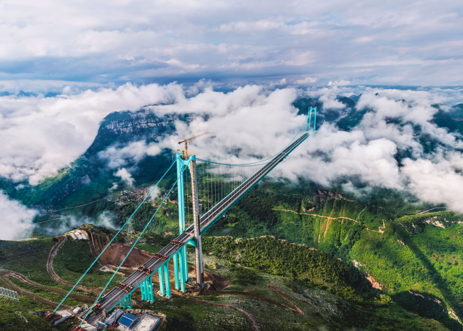 花江峡谷大桥因跨越被誉为“地球裂缝”的花江大峡谷而得名,是贵州六枝至安龙高速公路的关键控制性工程,全长2890米,主桥跨径1420米,桥面到水面高度625米,主桥跨径居山区桥梁跨径世界第一、桥梁高度居世界第一,被称为“横竖”都是世界第一,是一座由中国建设者亲手绘出的“云端奇迹”。