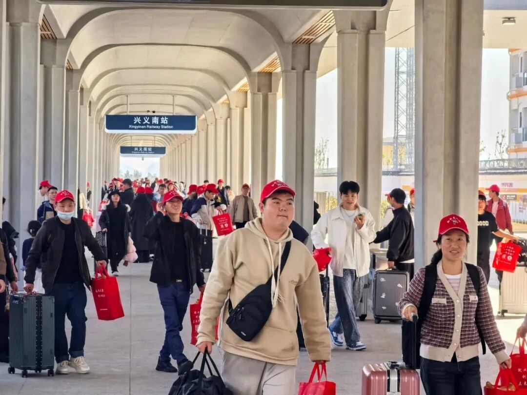 为应对大客流,兴义南站精准施策、全力保障。针对假期出行需求,车站加开贵阳北方向凌晨红眼列车,补足夜间运力缺口;同时加密候车室、检票口、站台等关键区域巡查频次,强化旅客引导与秩序维护,优化进出站流线,全力保障旅客出行安全、高效、顺畅。