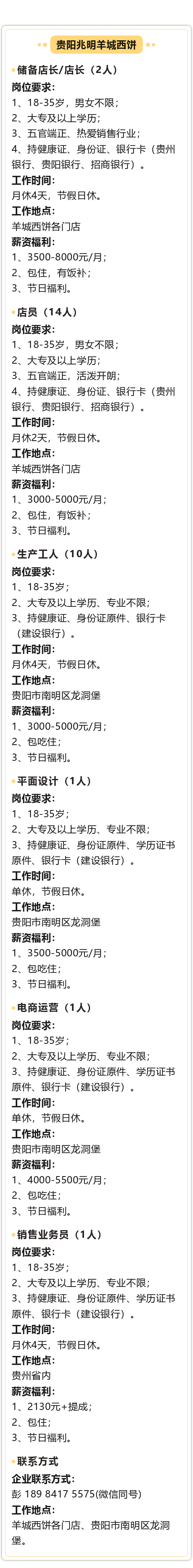 贵阳兆明羊城西饼招聘储备店长/店长、店员、生产工人、平面设计等!月薪可达8000元!