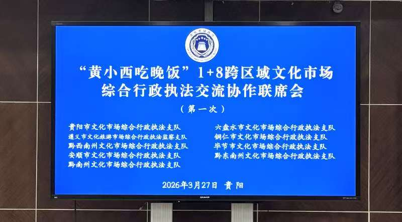 3月27日,“黄小西吃晚饭”1+8跨区域文化市场综合行政执法交流协作第一次联席会议在贵阳召开。来自贵阳市、六盘水市、遵义市、铜仁市、黔西南州、毕节市、安顺市、黔东南州、黔南州等九市州的文化市场综合行政执法队伍代表齐聚一堂,总结执法经验、共商共治路径,让贵州的旅游保障更贴心,游客的旅途更安心。