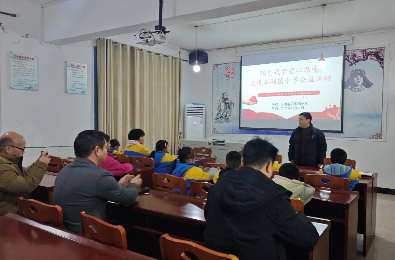 近日,天柱县石洞镇小学接收到了浓浓的暖意。受联创保险销售有限公司委托,筑梦远扬教育发展协会及石洞籍爱心人士一行,开展了2025年度“联创·筑梦”爱心助学公益活动,为该校学生送上了新年祝福与助学金。