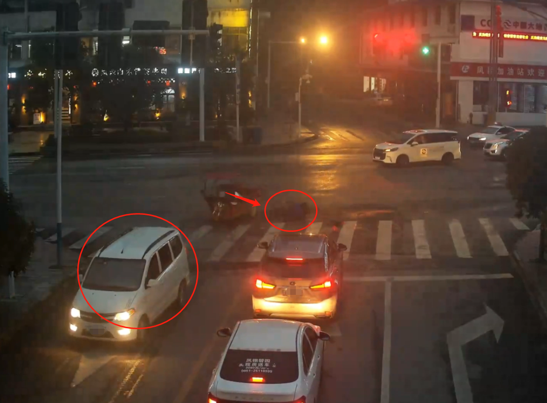 画面显示,当日18时42分许,李某驾驶一辆无号牌三轮电动车沿茶海大道由北向南行驶,行驶至凤冈加油站十字路口时,未按交通信号灯行驶,闯红灯与任某驾驶的号牌为贵C70**8的小型普通客车相撞肇事。
