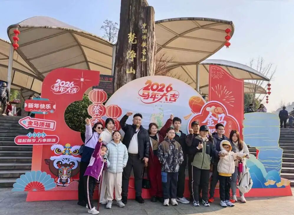 活动期间,梵净山旅游区新春氛围营造,从游客中心、预检区,到佛手广场、莲花广场、西山门等核心区域,通过悬挂红灯笼、新春春联、中国结,搭配马年主题特色美陈,打造一步一景的新春打卡场景,氛围布置覆盖整个新春佳节,让游客入园即沉浸式感受浓浓年味,全方位提升游览体验。