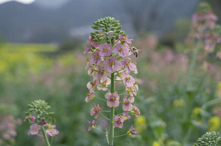 在万福村梁家桥,彩色油菜花开得正旺。春风拂过,花香沁人心脾。白色、橙色、粉色的花朵在阳光下随风摇曳,蝴蝶和蜜蜂在花间“飞舞”,宛如一幅色彩斑斓的油画。