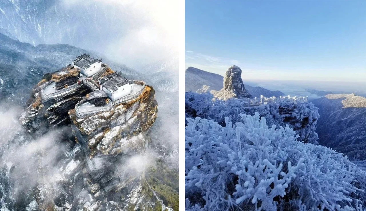 真实版的天空之城,世界自然遗产。冬天的梵净山,多的是你意料之外的惊喜,湛蓝的天空,皑皑的雪山,远远望去,冷冽绝美如仙境,缥缈得不像话,绝对是高山雪景中的“天花板”。