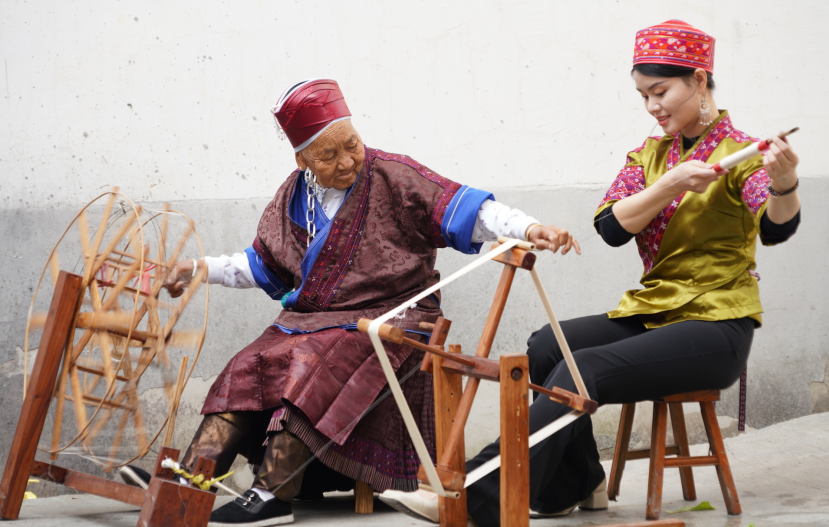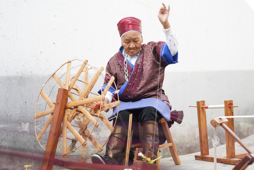 据雷英介绍,今天做的这个纺织是从今年的三月份就做了准备。“我们自己从农历的四、五月份就养蚕宝宝到抽丝、染线,今天才得这些丝线来拉线,然后要把它放在织布机上织成布,随后我们就可以用来刺绣、做裙子、做盛装了,全都是纯手工制作的。”