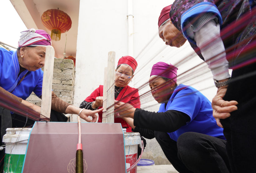 金秋时节,正是勤劳的手工艺人迎来自由的纺织时间,经过一年来自己养蚕获得丝线后,在秋后的闲暇时间里,苗寨里的妇女们便相约聚在一起,织布纺衣,制作新衣服。趁着这个空闲时间,雷英请来村里的苗绣技师们,聚在自家的院子里,积极向老一辈手艺人讨教更多传统的苗绣技艺。