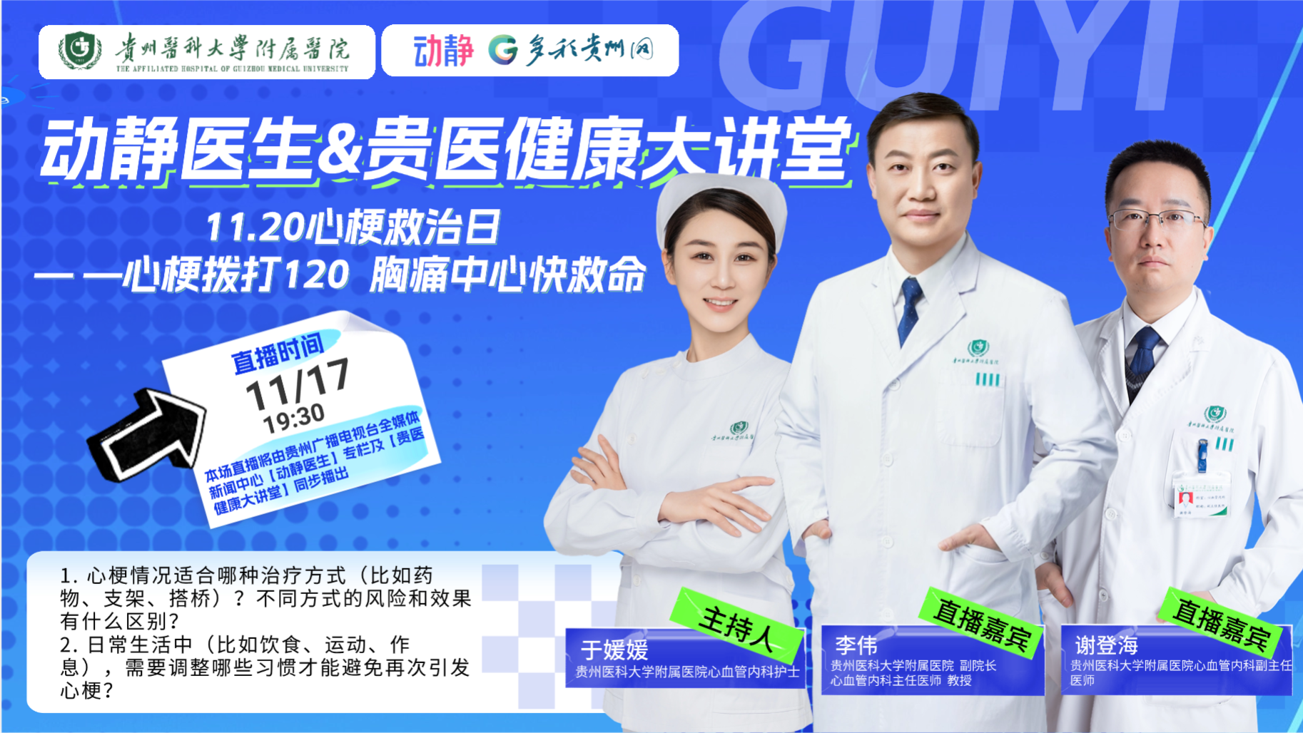 为响应“1120心梗救治日”的号召,提高全民防治意识,11月17日(今天)19:30分,【动静医生】专栏联合贵州医科大学附属医院,邀请贵州医科大学附属医院副院长、心血管内科李伟教授,贵州医科大学附属医院心血管内科副主任医师谢登海做客直播间,为你彻底讲清如何识别心梗、把握急救黄金时间、科学选择治疗方案,以及做好术后康复与长期预防,守护每一颗心脏。