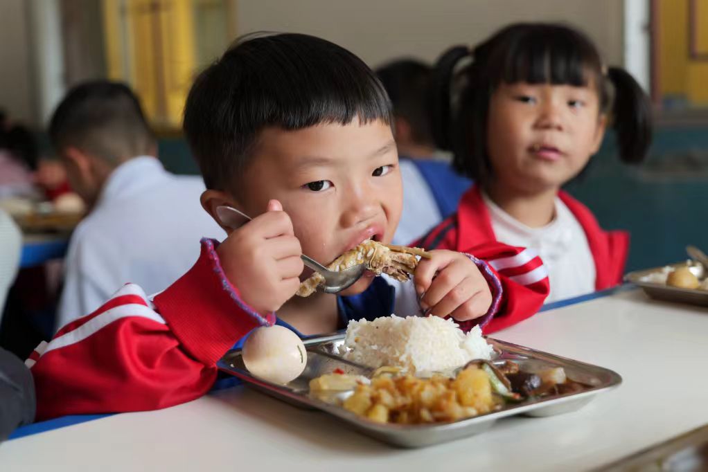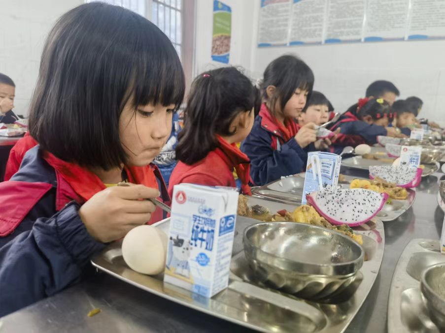 “学校食堂每天的饭菜都很丰富,有肉、水果、鸡蛋和牛奶,我们不仅能吃饱,还吃得很好。”杨亦瑶说。杨亦瑶家距离学校有3公里,来回要走50分钟,若每天回家吃饭,会耗费大量时间,对学习也有一定影响。而学校营养餐的实施,不仅为她节省了路途时间,还让她吃得营养又健康。