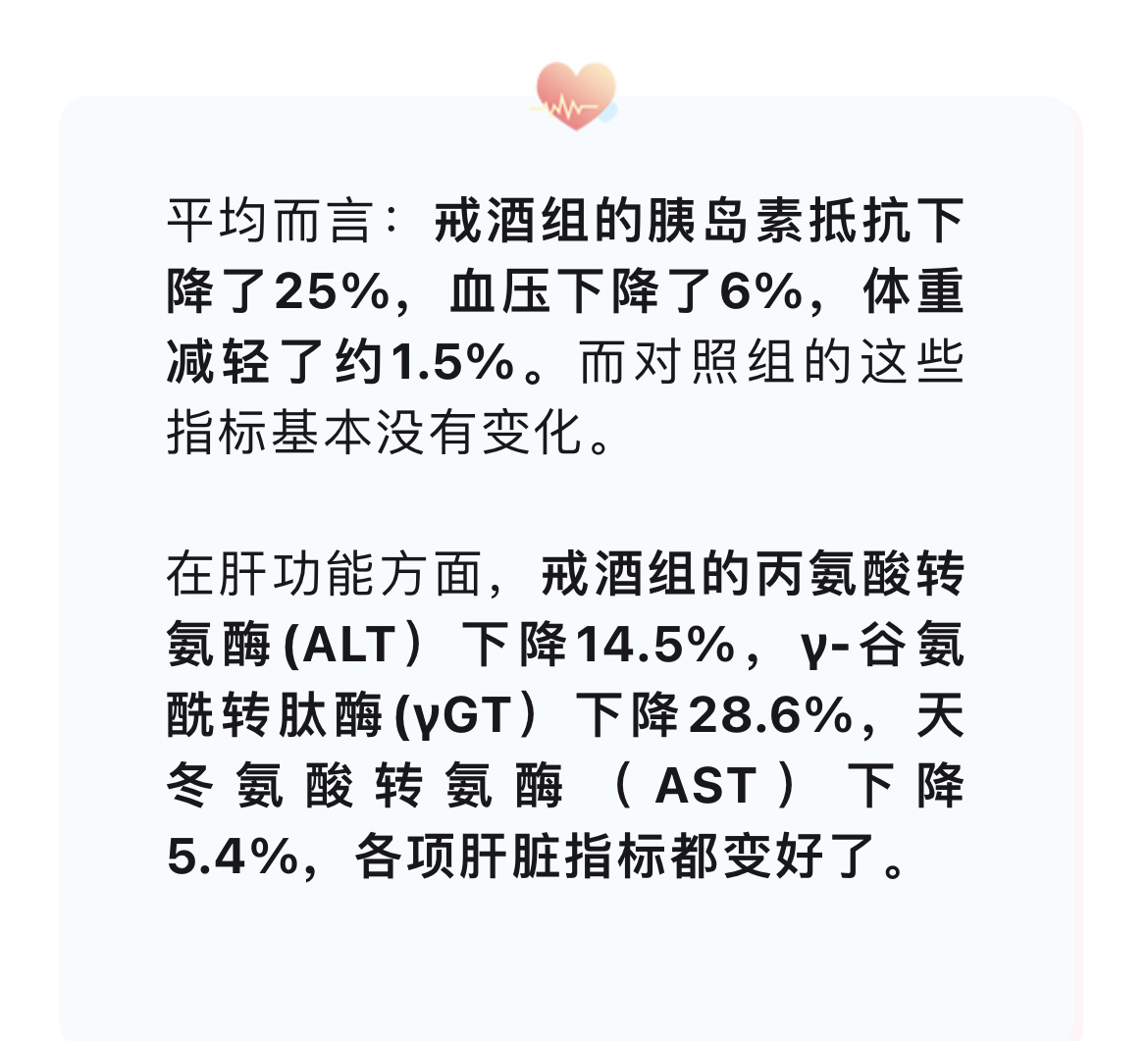 平均而言:戒酒组的胰岛素抵抗下降了25%,血压下降了6%,体重减轻了约1.5%。而对照组的这些指标基本没有变化。