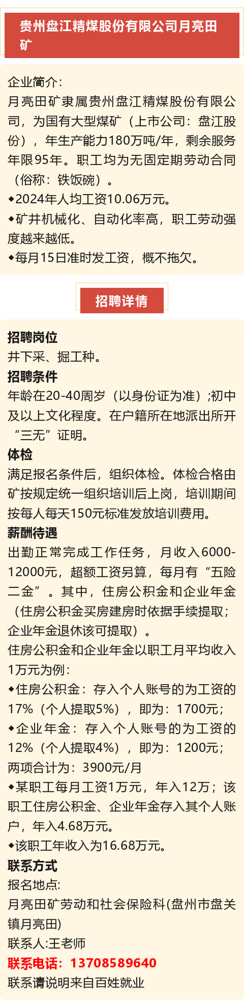 贵州盘江精煤股份有限公司月亮田矿招聘!月收入6000-12000元!五险二金!
