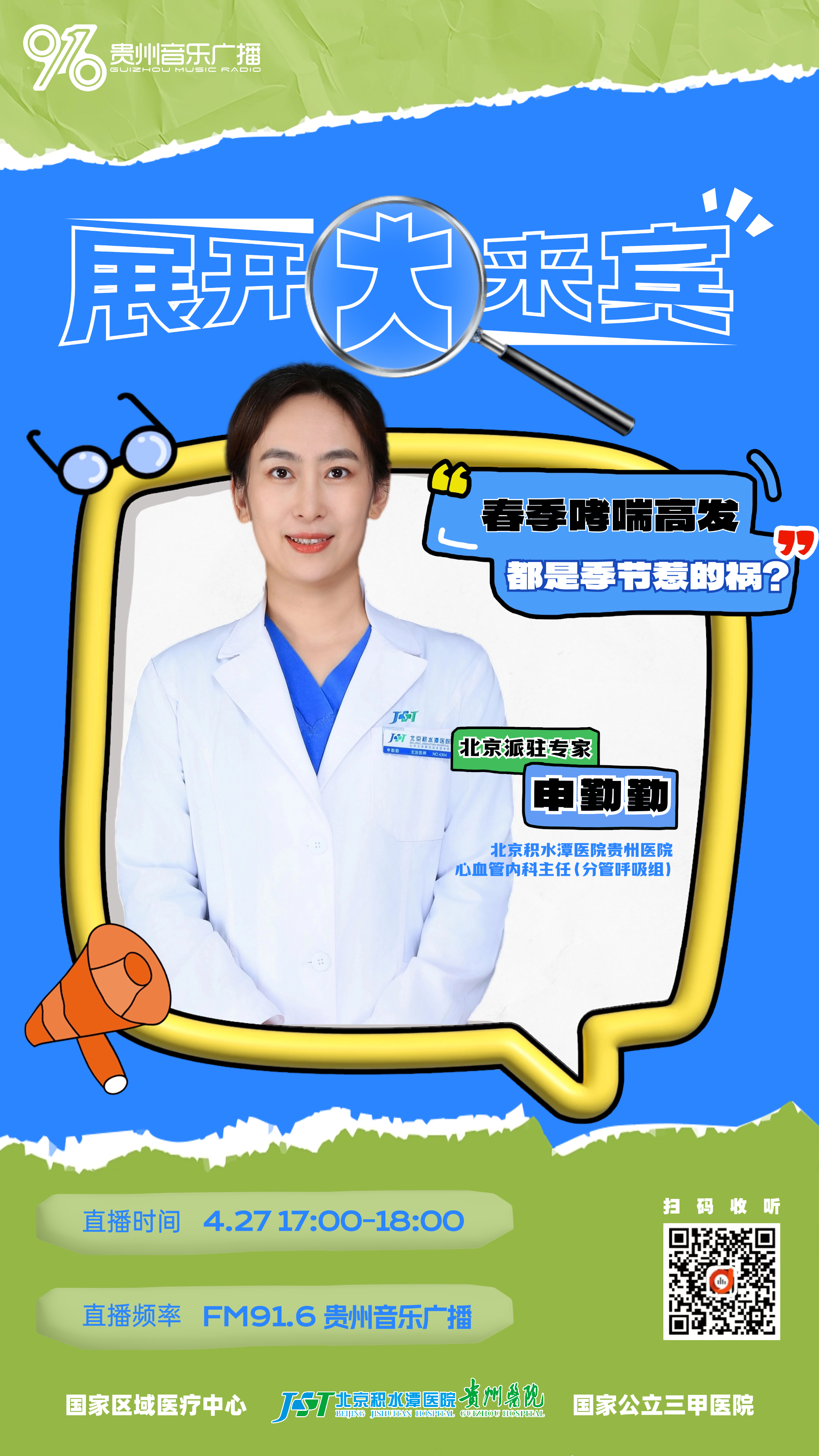 FM91.6贵州音乐广播邀请北京积水潭医院贵州医院心血管呼吸内科主任申勤勤来聊聊“哮喘”这个疾病。