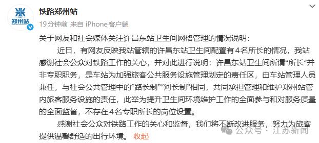 近日,有网友反映我站管辖的许昌东站卫生间配置有4名所长的情况,我站感谢社会公众对铁路工作的关心,并对此进行说明:许昌东站卫生间所谓“所长”并非专职职务,是车站为加强旅客公共服务设施管理划定的责任区,由车站管理人员兼任,与社会公共管理中的“路长制”“河长制”相同,共同承担管理和维护郑州站管内旅客服务设施的责任,此举为提升卫生间环境维护工作的全面参与和对服务质量的全面监督,不存在4名专职所长的岗位设置。