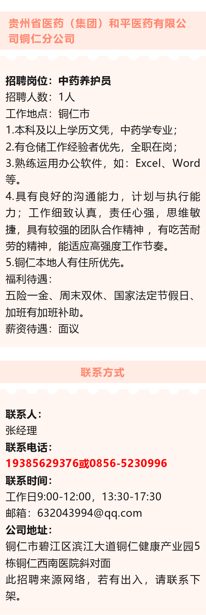贵州省医药(集团)和平医药有限公司分公司招聘!五险一金!