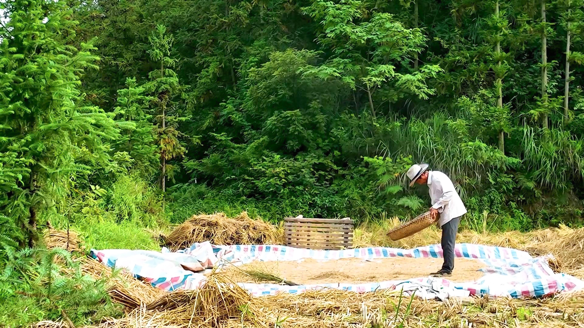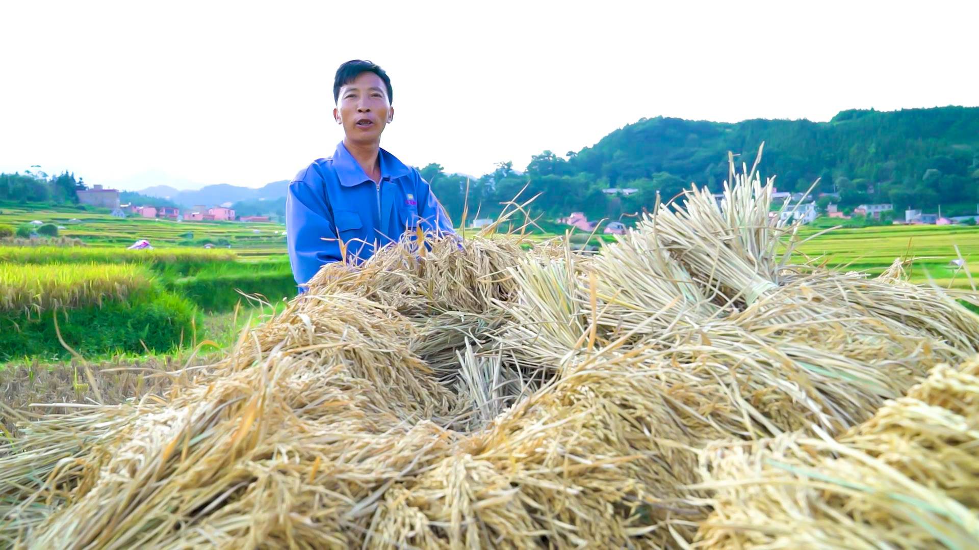 梯田边上的村庄就是旧屯村,这些年来,村民们种植红米尝到了甜头,日子越过越好。相较往年,今年的雨水更充足,气温更高,稻谷增产了16.44%。趁着天气好,村民杨天友已早早赶到田里,将割好的稻子码成堆,等全部割完后再统一将谷子打了收回家,留足一家人一年到头的口粮,其余的会有外地客商上门来收购。