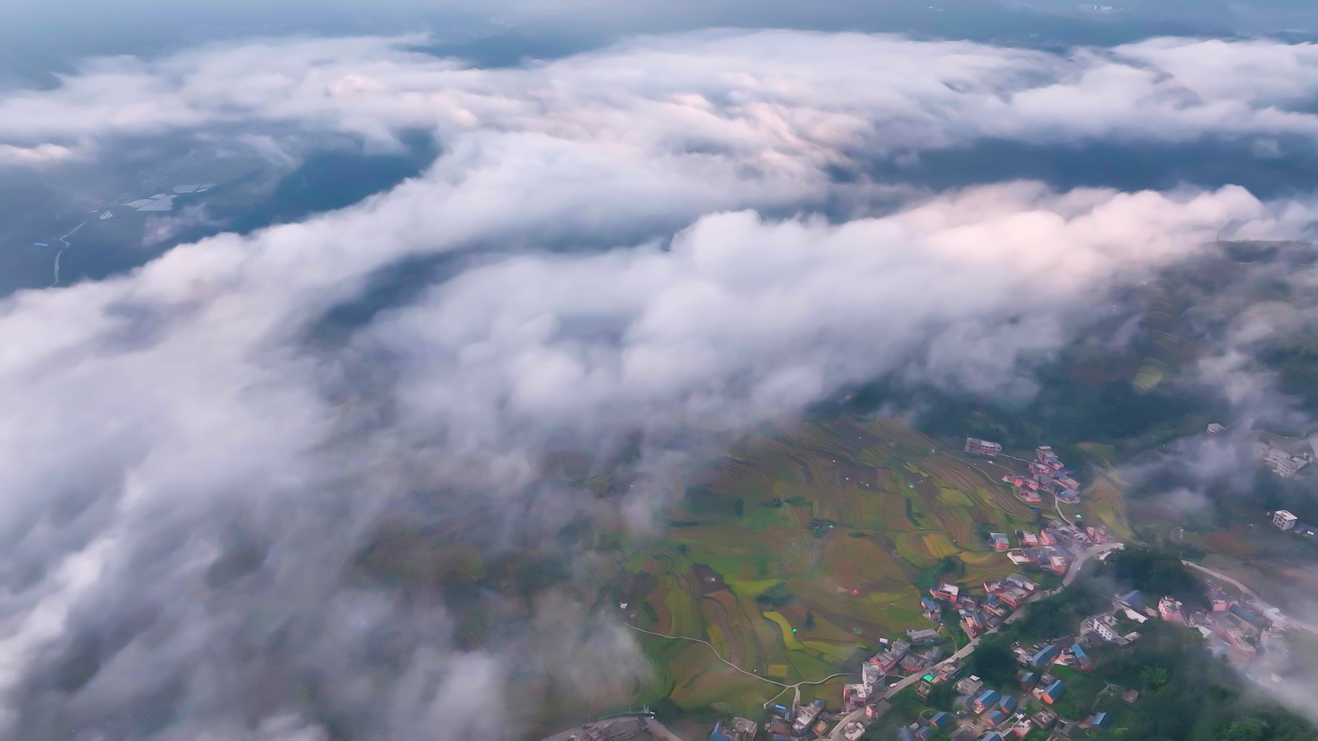 万亩梯田位于珠江支流之一的楼下河边上,海拔较低,出现云海景观比较罕见。只见航拍镜头下的云波雾海,在万亩梯田上方翻滚流淌,阳光偶尔穿过云海,形成一束束“丁达尔”射光,照射在梯田上,稻田和梯田上的村庄不时隐现,蔚为壮观。