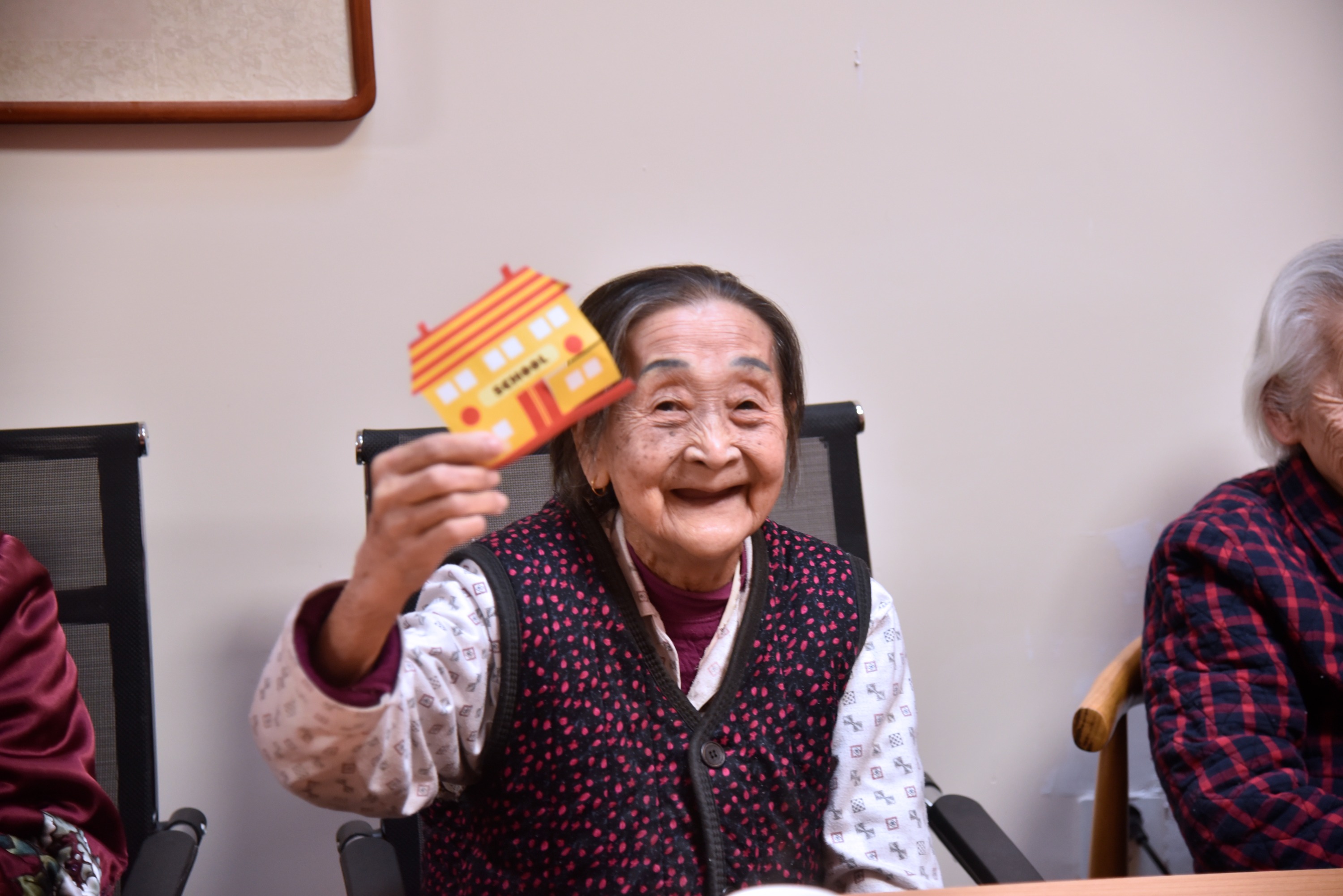 性格活泼的陈奶奶望着桌上的剪纸,瞬间提起了她的兴趣。志愿者罗渊在一旁指导教学时,陈奶奶不仅学得认真,使用剪刀还特别娴熟,不断尝试着剪出喜欢的图案。很快,一幅精美的小屋图案在罗渊的帮助下完成了。看到自己的成果,陈奶奶向周围的伙伴们“炫耀”起她的作品,不禁露出开心和满足的笑容。