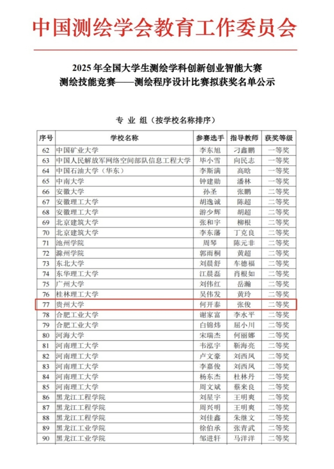 贵大新闻网讯(矿业学院)全国大学生测绘学科创新创业智能大赛于7月31日至8月1日在内蒙古科技大学举行。贵州大学矿业学院测绘工程专业学子在此次赛事中共获得特等奖1项、一等奖1项、二等奖2项的荣誉,实现了我校在该项赛事中特等奖的历史性突破。