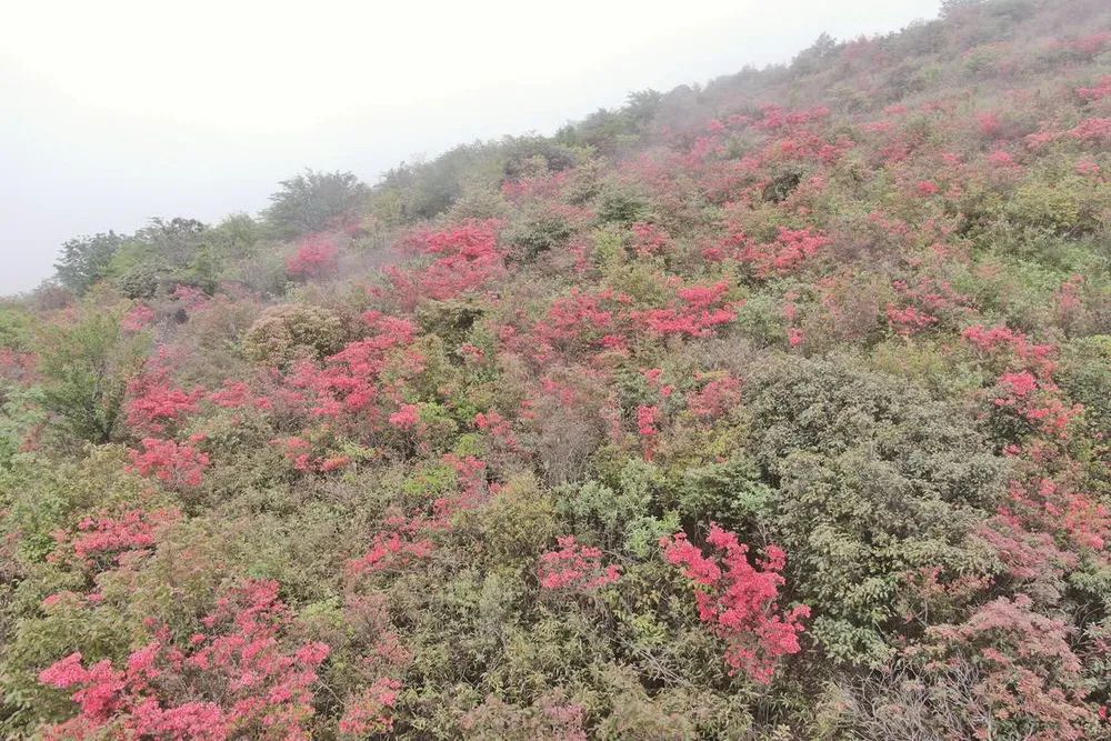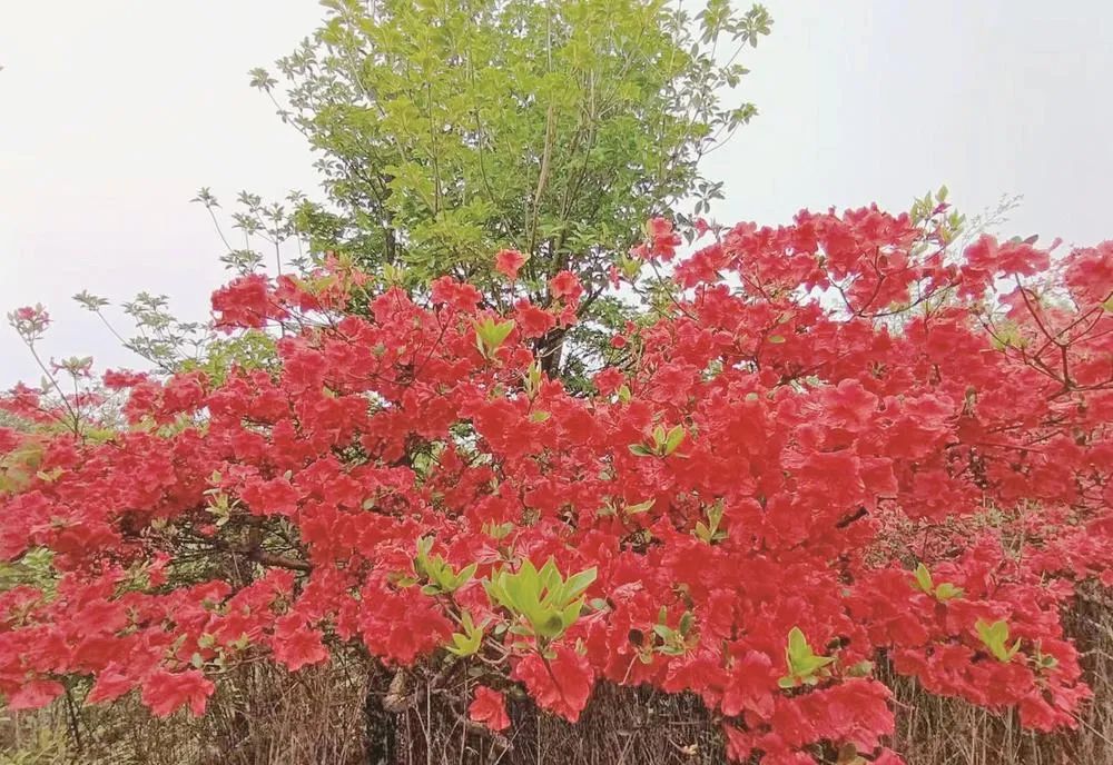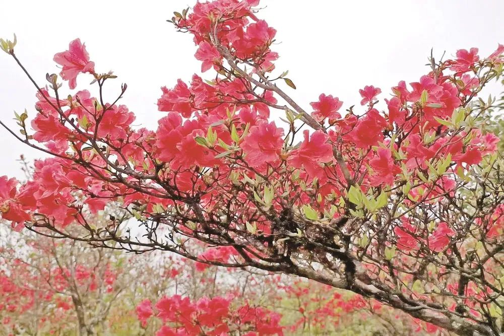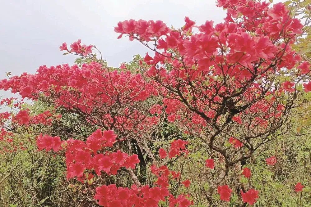 笔者在梵净山西麓印江土家族苗族自治县斗篷山上看到,在薄雾笼罩下,次第开放的高山杜鹃一直从山腰开到山顶,花开似锦,灿若云霞。走进花丛中,只见有的正含苞待放,有的已完全绽放,一簇簇,一团团,火红的花朵一朵挨着一朵,一朵紧靠一朵,压弯了整个枝丫,迎风摇曳,姿态万千,让人心旷神怡。